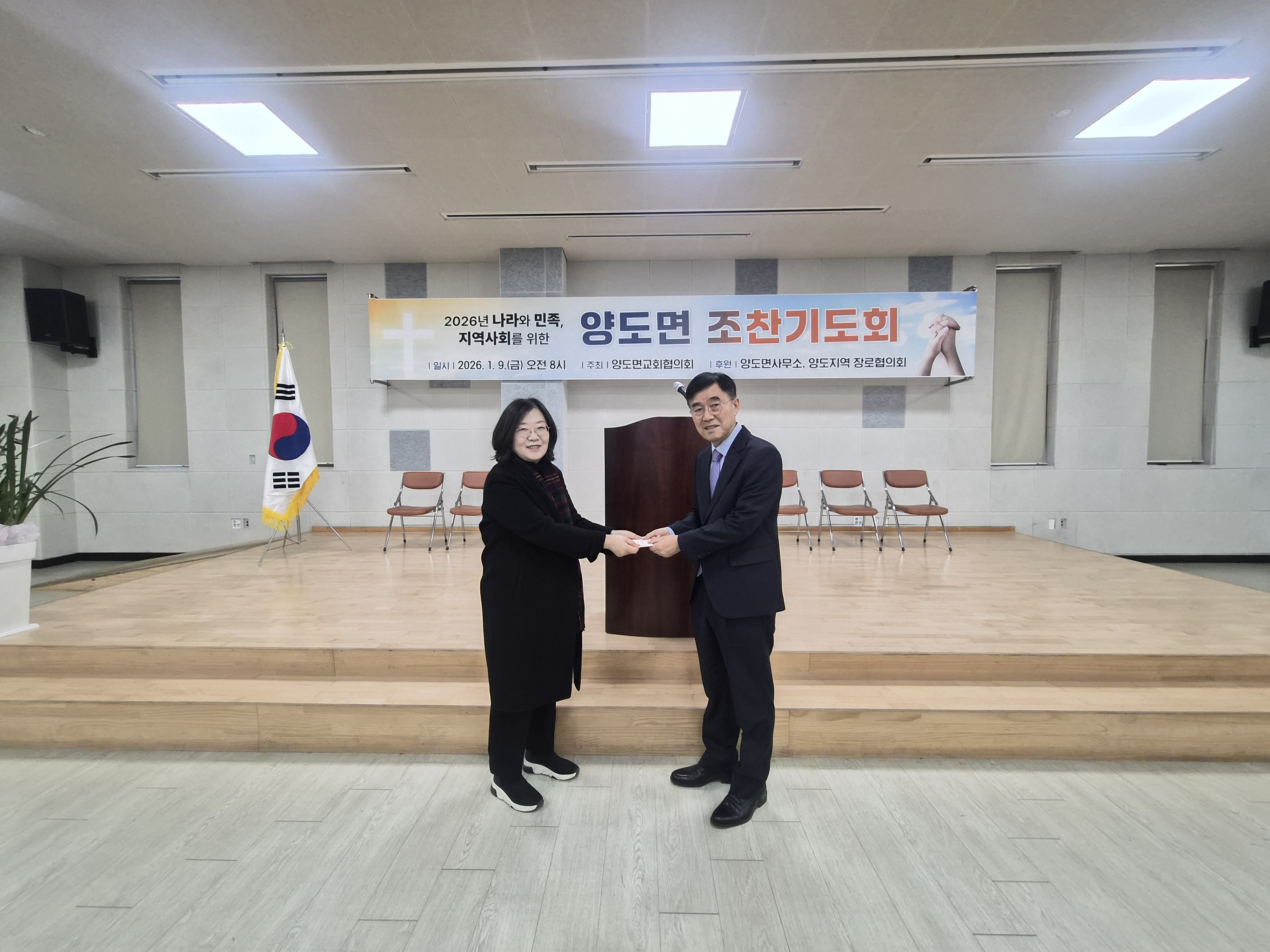 양도면 교회협의회는 매년 지속적인 나눔을 실천하는 단체로, 이날 교회협의회에 소속된 11개 교회에서는 새해를 맞아 조찬 기도회를 개최한 후 이웃돕기 성금을 함께 전달하며 더욱 의미있는 시간을 가졌다.