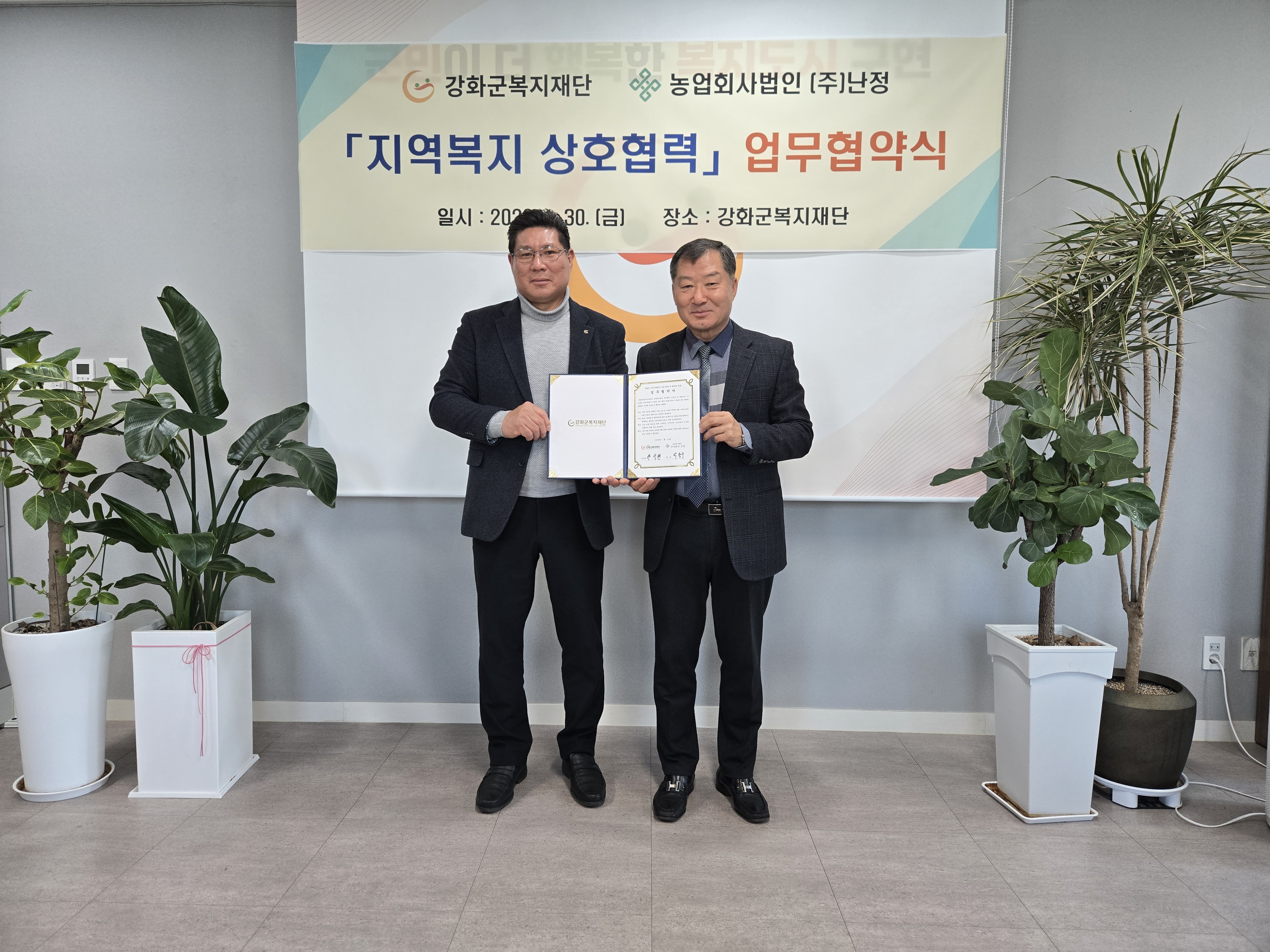 강화군복지재단(이사장 한석현)이 지난 30일, 농업회사법인 ㈜난정(대표 박용구)과 농촌 일손 돕기 상호 협력을 위한 업무협약을 체결했다.