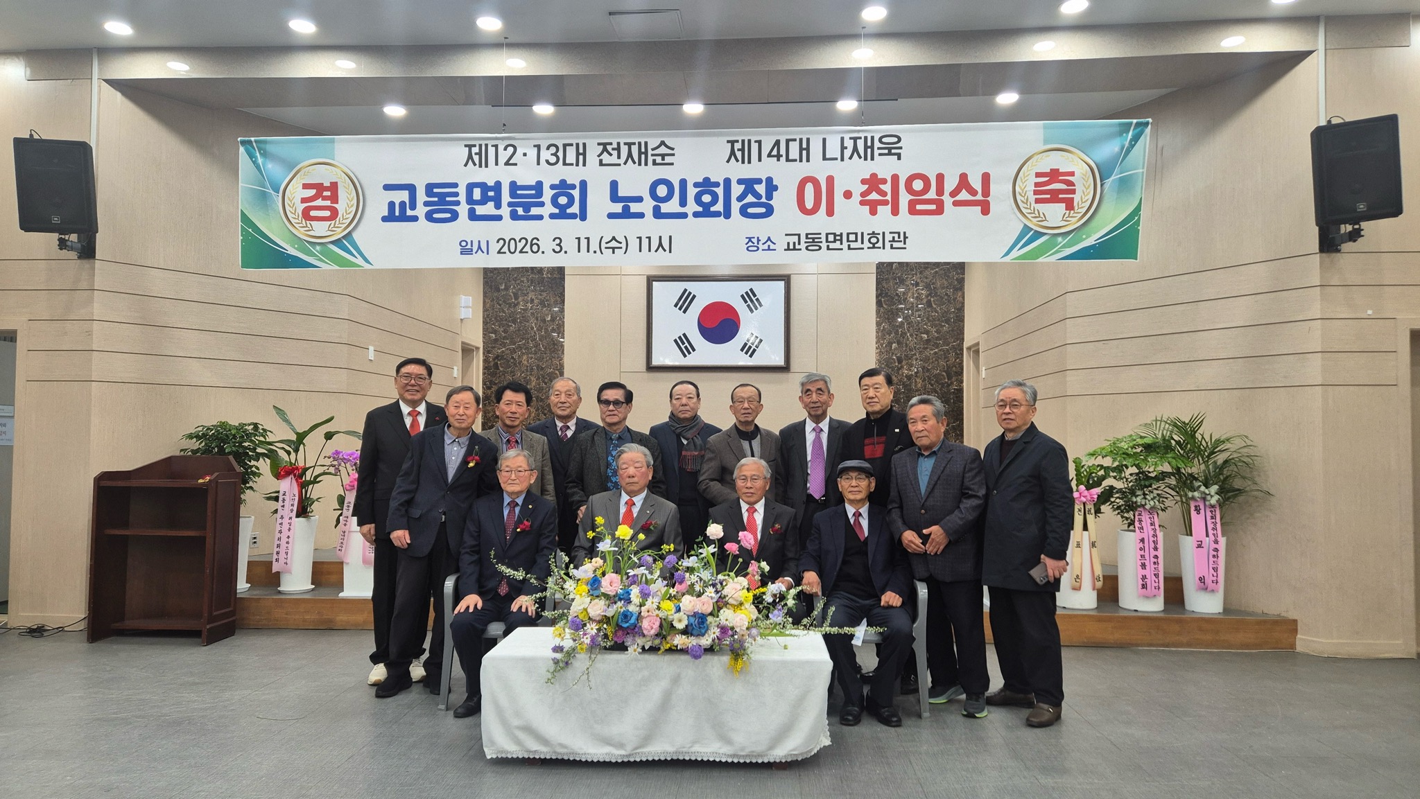 장기천 지회장은 축사를 통해 “그동안 수고해 주신 제13대 전재순 회장의 노고에 감사드리고 제14대 나재욱 회장의 취임을 축하드린다”며, “앞으로 더욱 발전하는 교동면 노인회가 되기를 바란다”고 말했다.