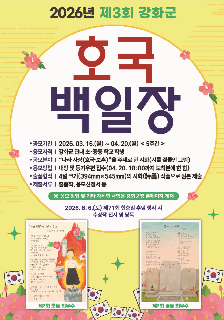 공모 분야는 ‘나라사랑(호국·보훈)’을 주제로 한 시화(시를 곁들인 그림) 부문이다. 강화군 관내 초·중학교에 재학 중인 학생이면 누구나 참여할 수 있으며, 신청서는 강화군청 홈페이지에서 내려받을 수 있다.