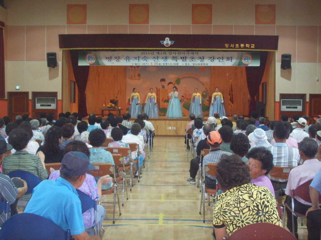 이번 아케데미는 초청강사인 유지숙 명창은 양사면 인화리 출생으로 중요무형문화재 제29호 서도소리 준보유자로써 소리꾼의 꿈을 가진 농촌소녀가 수많은 좌절과 절망을 극복하고 중앙무대에서 인정 받기까지의 과정을 서도소리의 대표곡인 “수심가”로 풀어나가 참석자들의 열화와 같은 박수로 강연이 중간 중간 끊기는 장면이 연출되기도 했다.