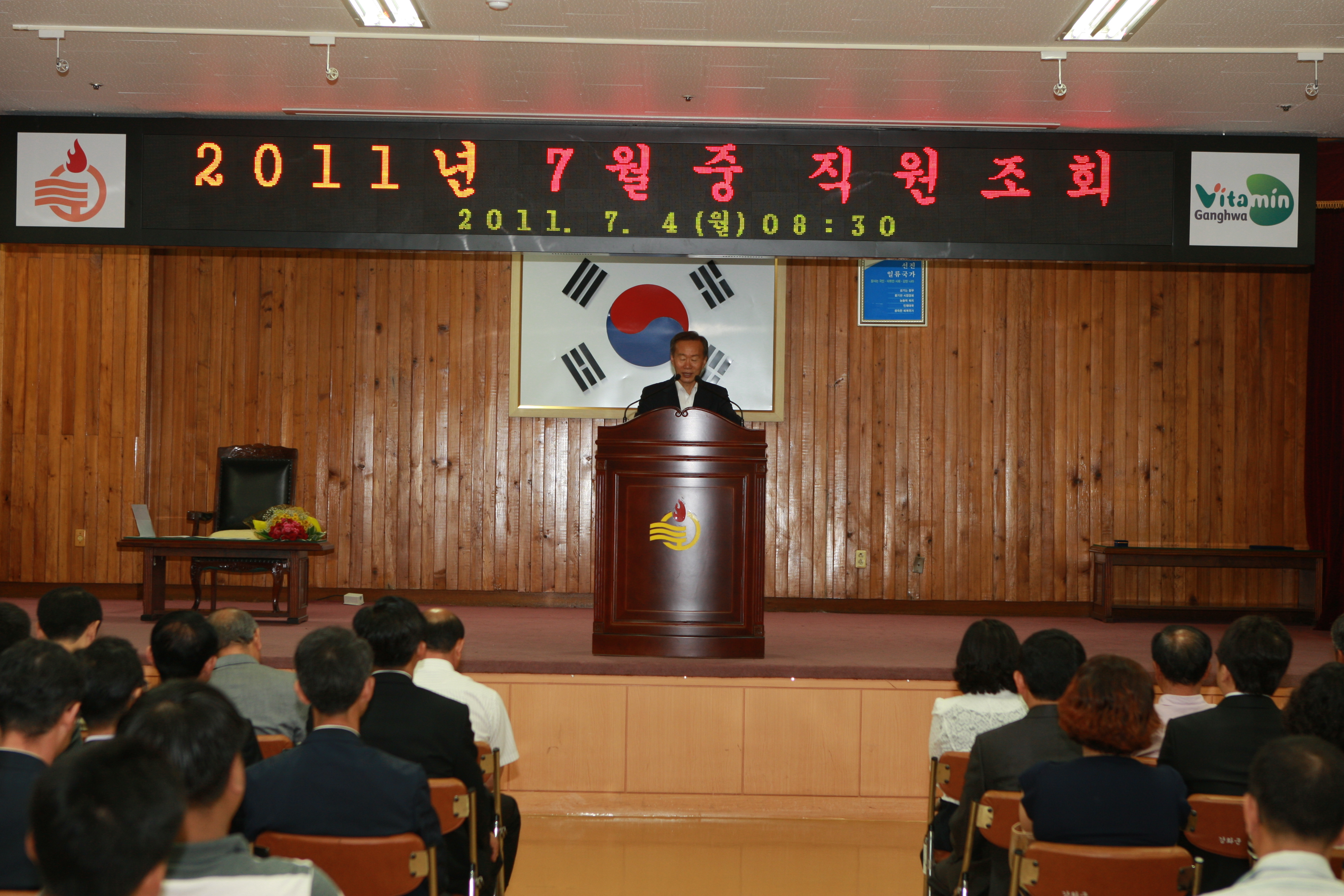강화군은 지난 4일 군청 회의실에서 안덕수 군수를 비롯한 실과소장 및 읍면장, 공무원 등 250여명이 참석한 가운데 7월중 직원 월례조회를 개최했다.