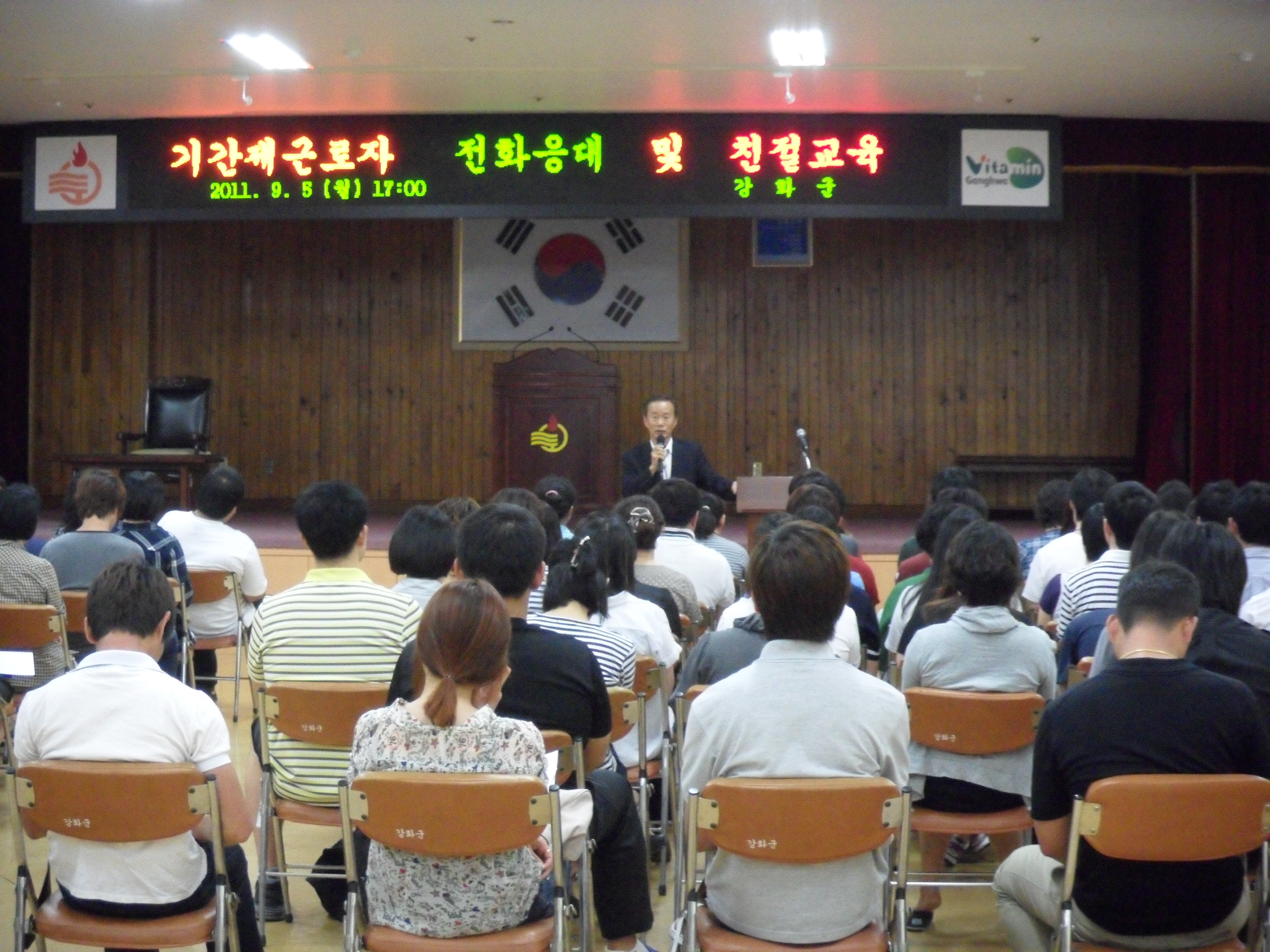 강화군(군수 안덕수)은 지난 5일 군청4층 회의실에서 본청 및 읍·면, 사업소에 근무하는 비정규직 근무자 등 100여명을 대상으로 전화응대 및 친절교육을 실시했다.