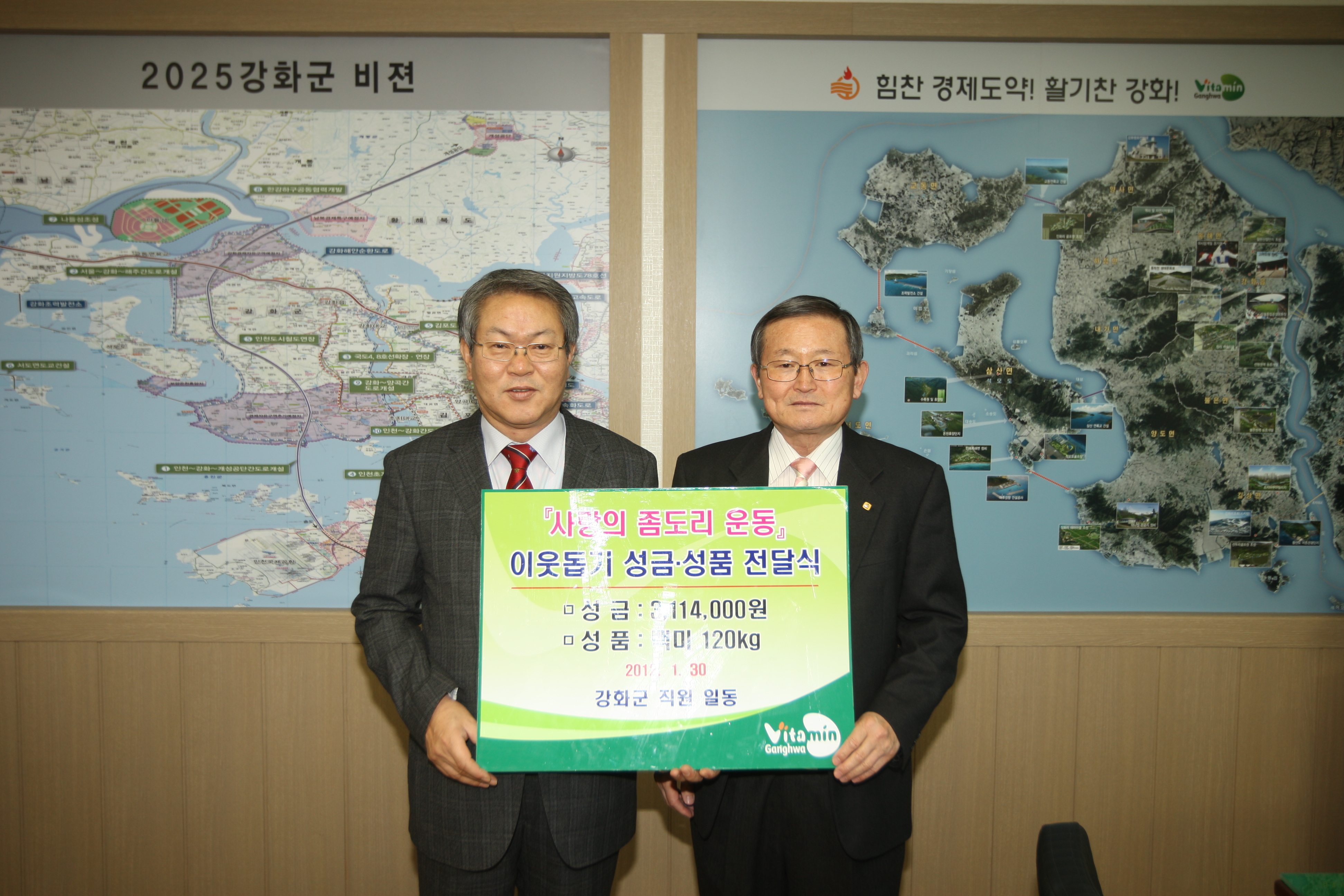 강화군은 지난 30일 군청 영상회의실에서 강화군수 권한대행 윤영중 부군수 및 새마을금고이사장(이사장 장기천) 등이 참석한 가운데 성금 3백십여만원과 백미 120kg에 대한 『사랑의 좀도리 운동 쌀』전달식을 가졌다.