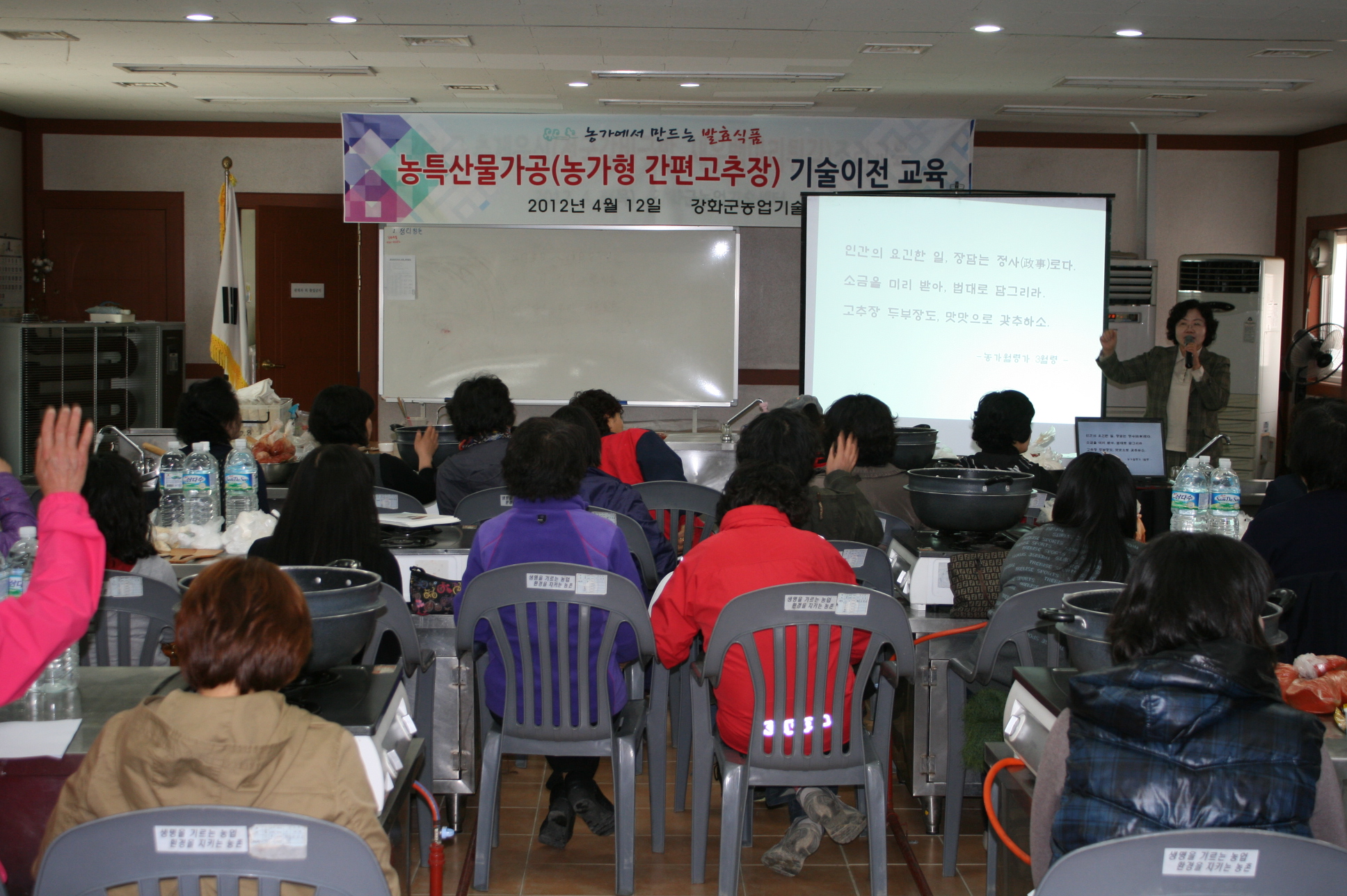 4월 5일 첫교육에서는 관심을 갖고 있는 농업인 80여명이 참여하여 성황을 이루었으며 간편고추장을 개발한 국립농업과학원 김은미 지도관의 직접 실습 및 시연지도가 있었다.