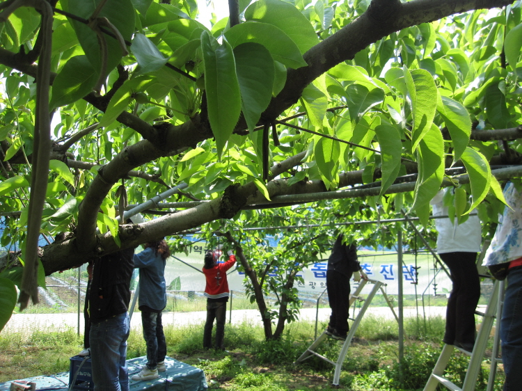 (사진 1.과수원에서 배 솎기 작업, 2, 인천 남구 일자리 추진단 지원 모습)