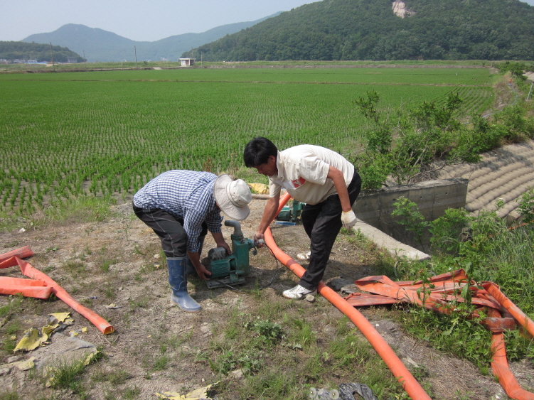 (사진: 가뭄으로 모내기를 못한 논에 양수작업을 하는 모습)