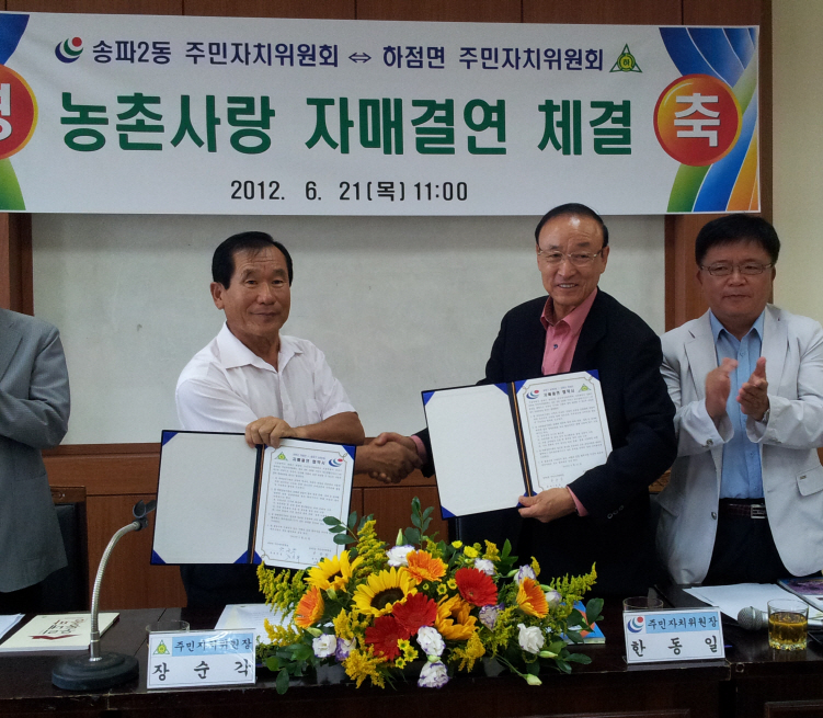 하점면주민자치위원회(위원장 : 장순각)와 송파2동 주민자치치위원회(위원장:한동일)는 지난 6월 21일 하점면사무소에서 상호 우호 증진과 교류를 위한 자매결연 협약식을 가졌다.