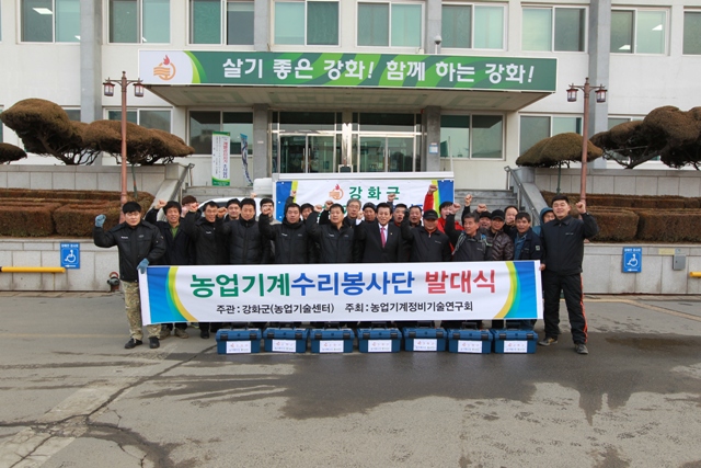 강화군(군수 유천호)은 지난 3월1일 서도면 농기계수리봉사에 앞서 “농기계수리봉사단 발대식”을 가졌다. 강화군은 농기계수리점이 없는 오지마을에 대하여 매년 농기계순회수리와 교육을 실시하고 있다. 한정된 기간에 지역의 농기계를 수리하기 위해서는 강화군에서 묵묵히 일하고 있는 농기계수리기사의 도움 없이는 어려운 실정이었다. 이러한 상황을 알고 강화군의 농기계수리기사의 모임인 “농기계정비기술연구회”에서 매년 순회수리봉사활동을 펼치고 있었다.