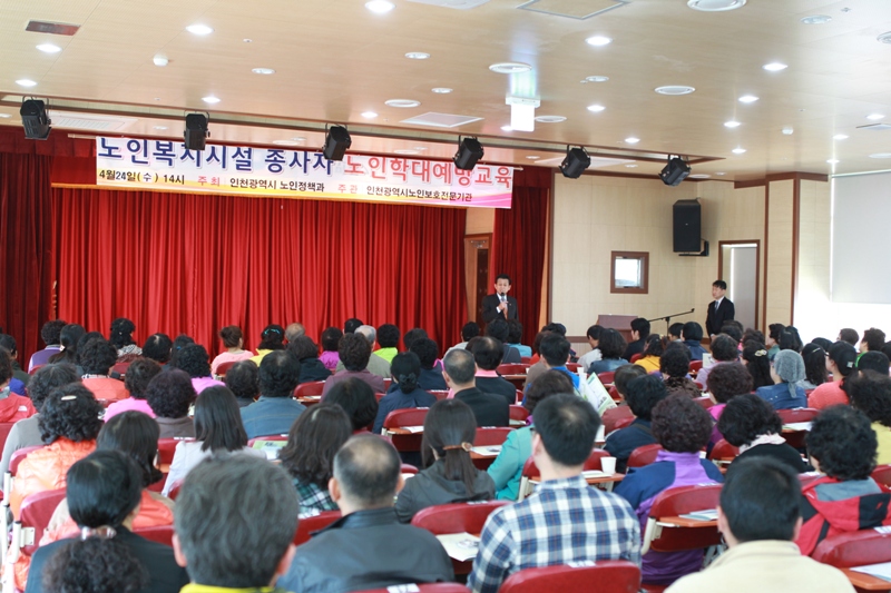 인천시 노인보호전문기관 주관으로 4월 24일 강화군노인복지관에서 노인복지시설 종사자(시설장, 사무관, 복지사, 간호사, 요양보호사 등) 250여명이 참석한 가운데 노인복지시설 노인학대 예방교육을 실시했다.