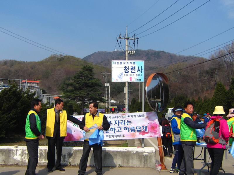 강화군 강화읍주민자치위원회(위원장 오동식)에서는 지난 4월 28일 제6회 고려산 진달래 축제를 맞이하여 강화읍 국화2리 청련사 입구에서 등산객들을 대상으로 쓰레기 되가져가기 캠페인 및 봉투 나누어 주기 행사를 전개했다.