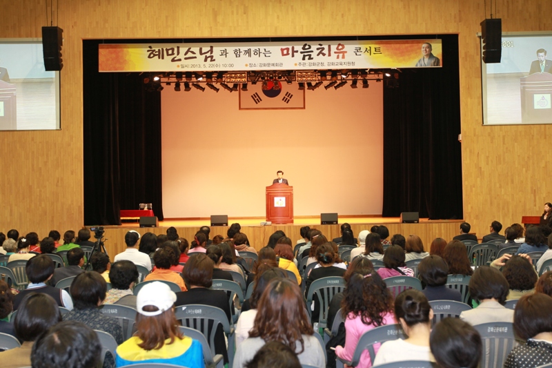 강화군(군수 유천호)은 지난 22일 오전 10시 강화문화예회관에서 지역주민 및 학부모 등 700여명이 참석한 가운데 강화교육지원청과 공동으로 혜민스님을 초청하여 “혜민스님과 함께하는 마음치유 콘서트”라는 주제로 강화아카데미를 개최했다.