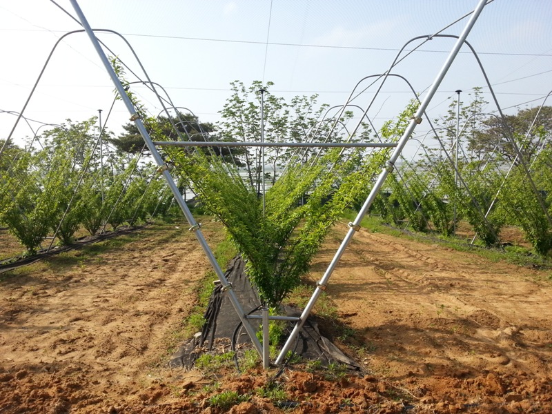Y자 수형 재배는 가지 늘어짐 방지와 결과모지 확보를 통한 초기 수량을 높일 수 있을 뿐 아니라 품질 향상과 원가지 선단부 고정을 통한 도장지 발생 경감 효과를 기대할 수 있으며, 방조망은 또한 성숙기 과실의 조류피해 방지 및 우박, 강풍 등 기상재해로 부터 피해경감 효과를 기대할 수 있다.