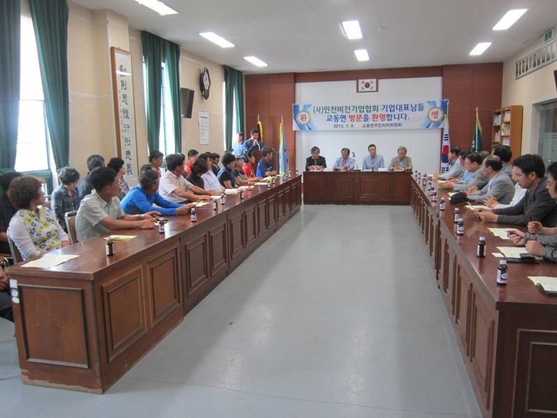 강화군 교동면 주민자치위원회(위원장 박상철)는 지난 6일 (사)인천비전기업협회(협회장 안재화)를 초청하여 상견례와 상호 교류방안을 협의하는 등 간담회를 가졌다.
