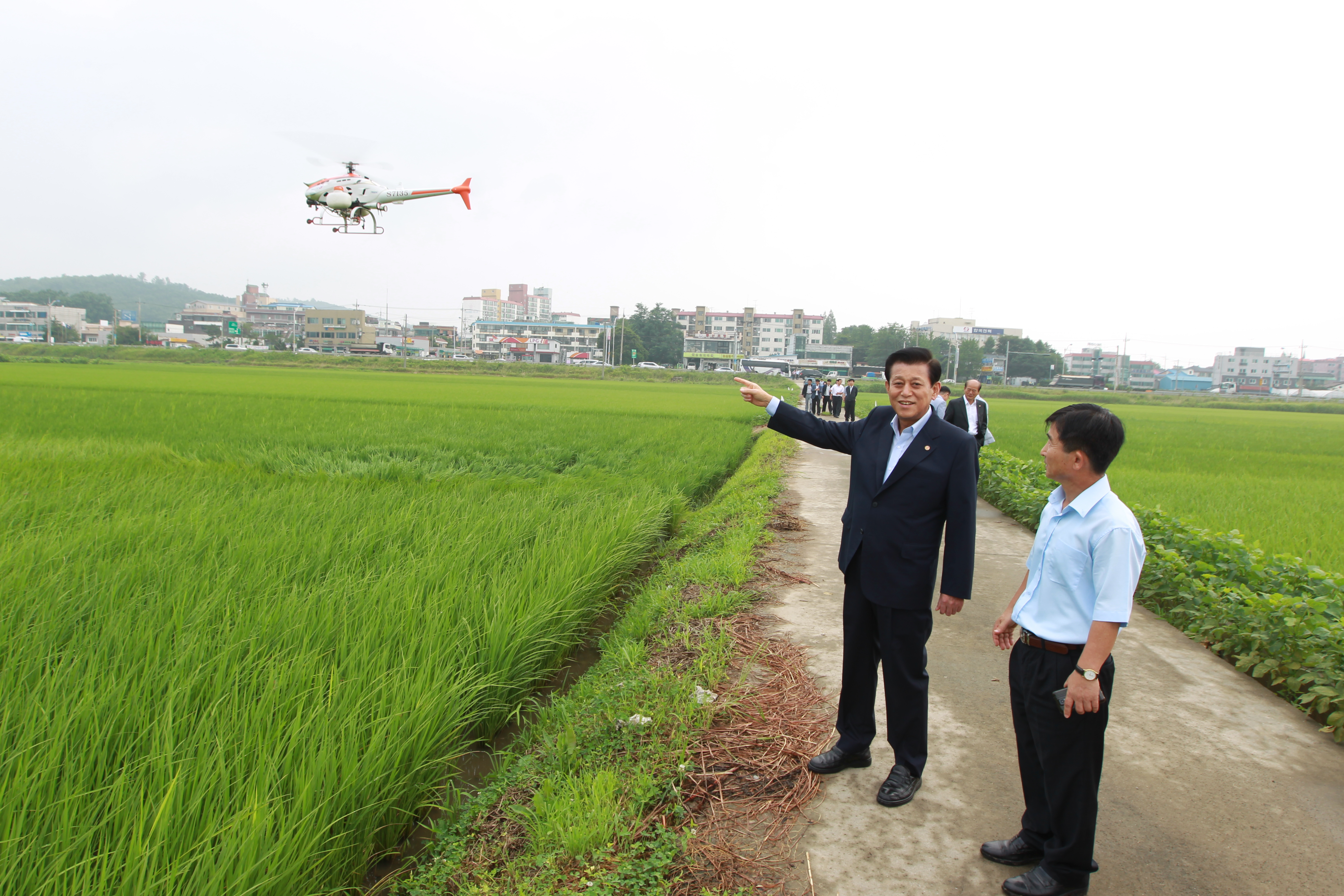 무인헬기를 이용한 항공방제는 지상 3~4m 상공에서 약제가 미세하게 살포하므로 헬기 하향풍이 작물을 흔들어 주어 약제가 줄기 하단부까지 균일하게 살포되는 등 정밀 방제로 방제효과가 큰 것이 장점이다.