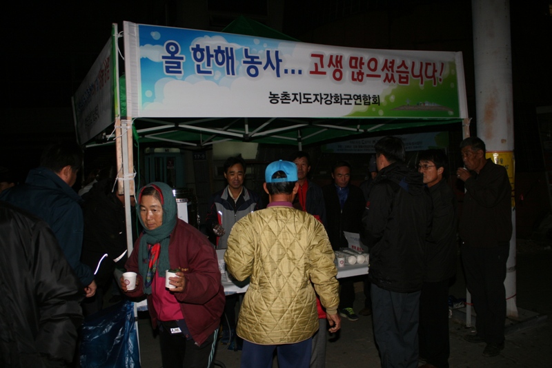 새벽부터 고생하는 이들을 위해 농촌지도자강화군연합회(회장 김근서)는 지난 2일 새벽, 지도자회 임원 20여명, 농업기술센터 직원과 함께 풍물시장에서 따뜻한 차와 떡을 나눠주는 봉사활동을 실시하여 주변사람들에게 훈훈한 귀감이 되었다.