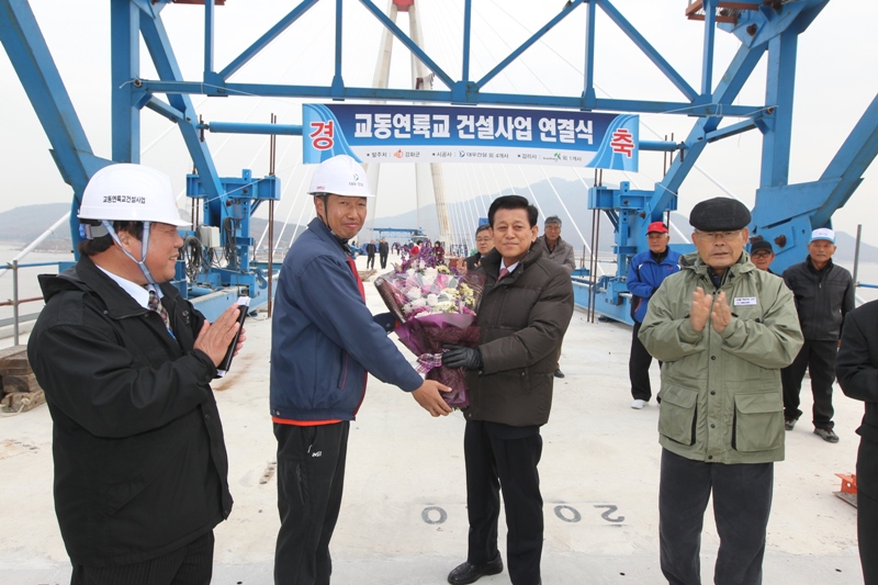 ㈜대우건설 강화군(군수 유천호)은 교동도와 강화도를 연결하는 교동연륙교 사장교 상판거치 완료에 따라 14일 오후 3시 강화군수와 교동면 기관단체장, 지역주민 등이 참석한 가운데 교동연륙교 연결식을 개최했다.