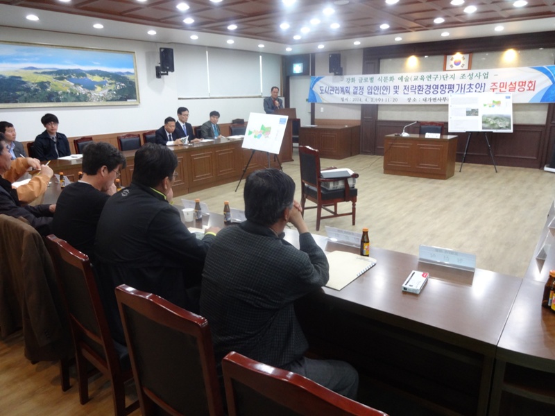 이번 설명회는 내가면 외포리 산81번지 일원에 조성되는 강화 글로벌 식문화 예술단지조성에 따른 도시관리계획 결정(변경) 입안(안) 및 전략환경영향평가(초안)에 대한 주민의견수렴을 위하여 마련됐다.