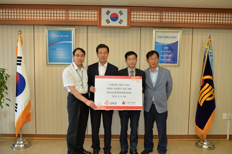 강화군 농협은행 강화군지부(지부장 이문재)에서는 지난 4일 우리 민족 고유의 명절 한가위를 맞아 어려운 이웃에게 전해 달라며 성금 3천만원을 강화군에 기탁했다.