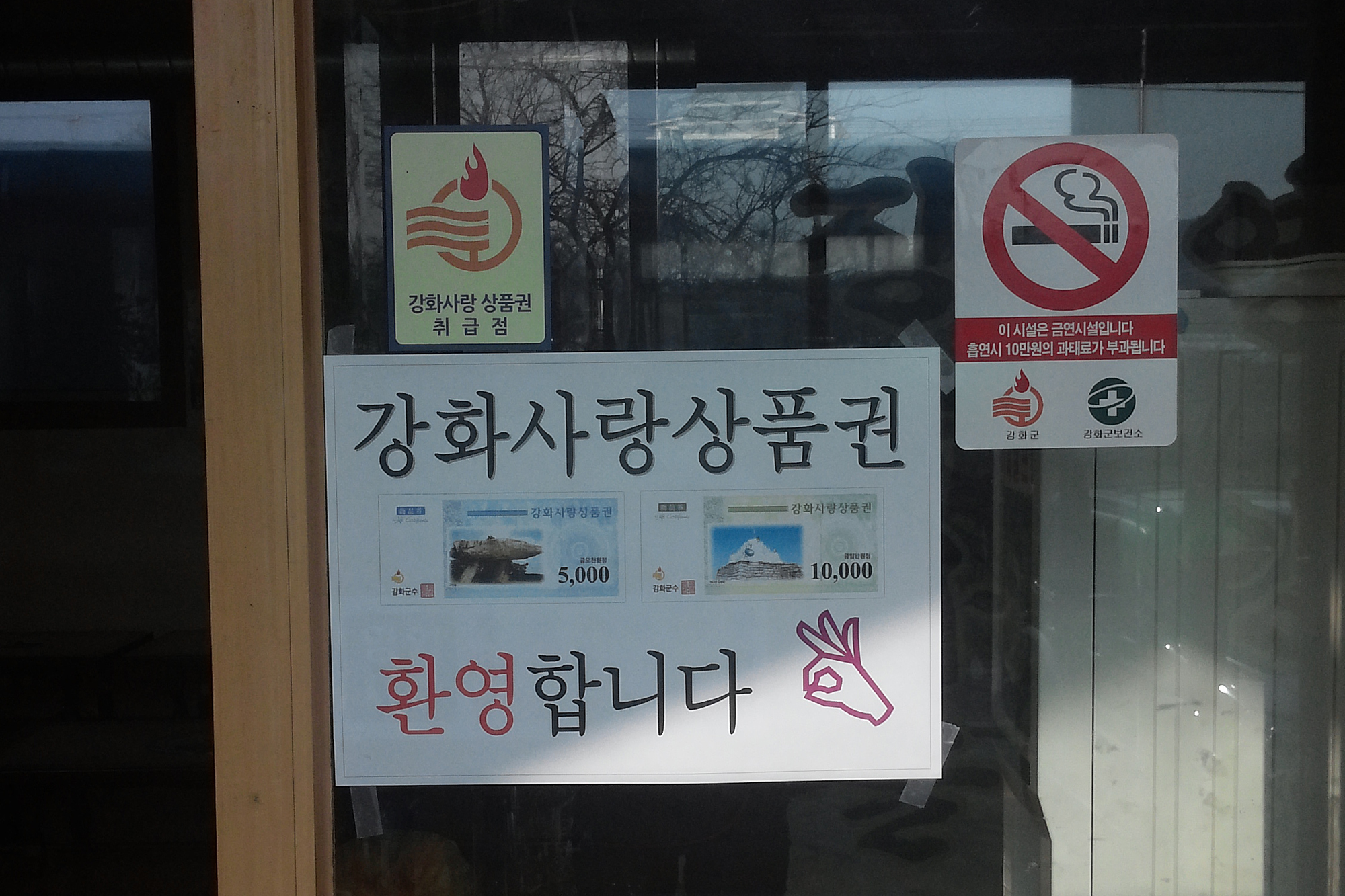 가게 문 앞에“강화사랑상품권, 환영합니다.”안내문 붙어