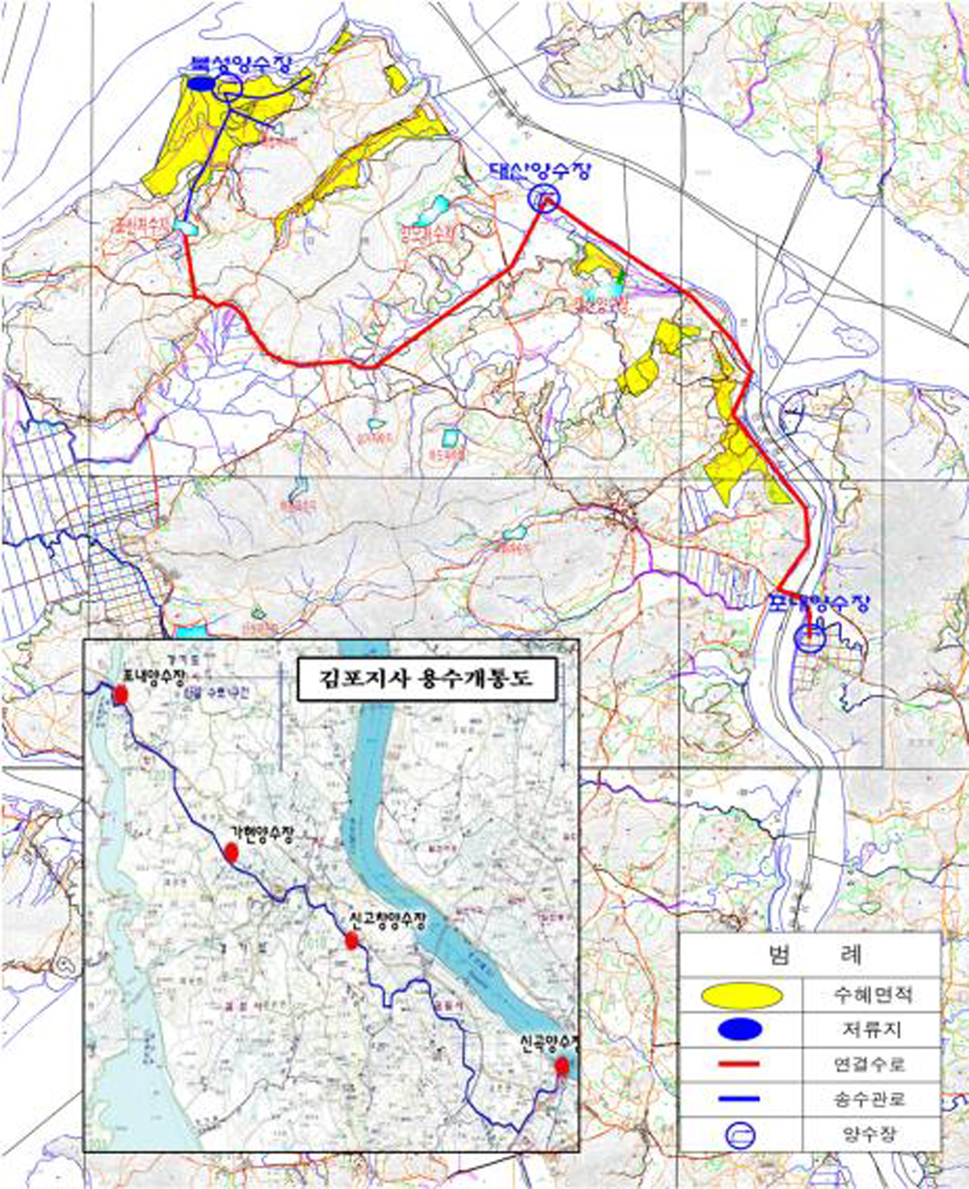 한강물 끌어오기 사업은 가뭄 피해를 대비하기 위한 항구적 사업으로 480억원이 소요된다. 김포시 월곶면 포내천에서 강화군 양사면 북성리까지 약 15km의 연결수로와 7km의 송수관로 그리고 100만톤의 농업용수를 저장할 수 있는 북성저류지와 양수장 3개소를 신설할 계획이다. 사업이 완료되면 1일 4만 8천톤의 농업용수가 통수되며 강화읍, 송해면, 하점면, 양사면 지역의 농경지에 부족한 농업용수를 확보하여 안정적으로 공급함으로써 향후 이상 기후로 인한 가뭄 피해는 역사속으로 사라질 것으로 보인다.
