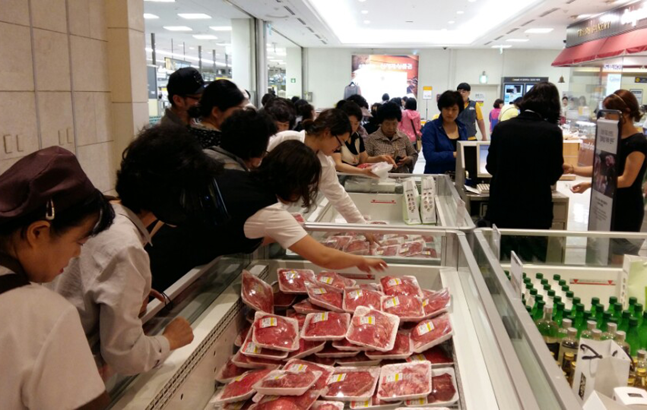 (사진: 신세계백화점에서 약쑥한우를 줄지어 구입하고 있다.)
