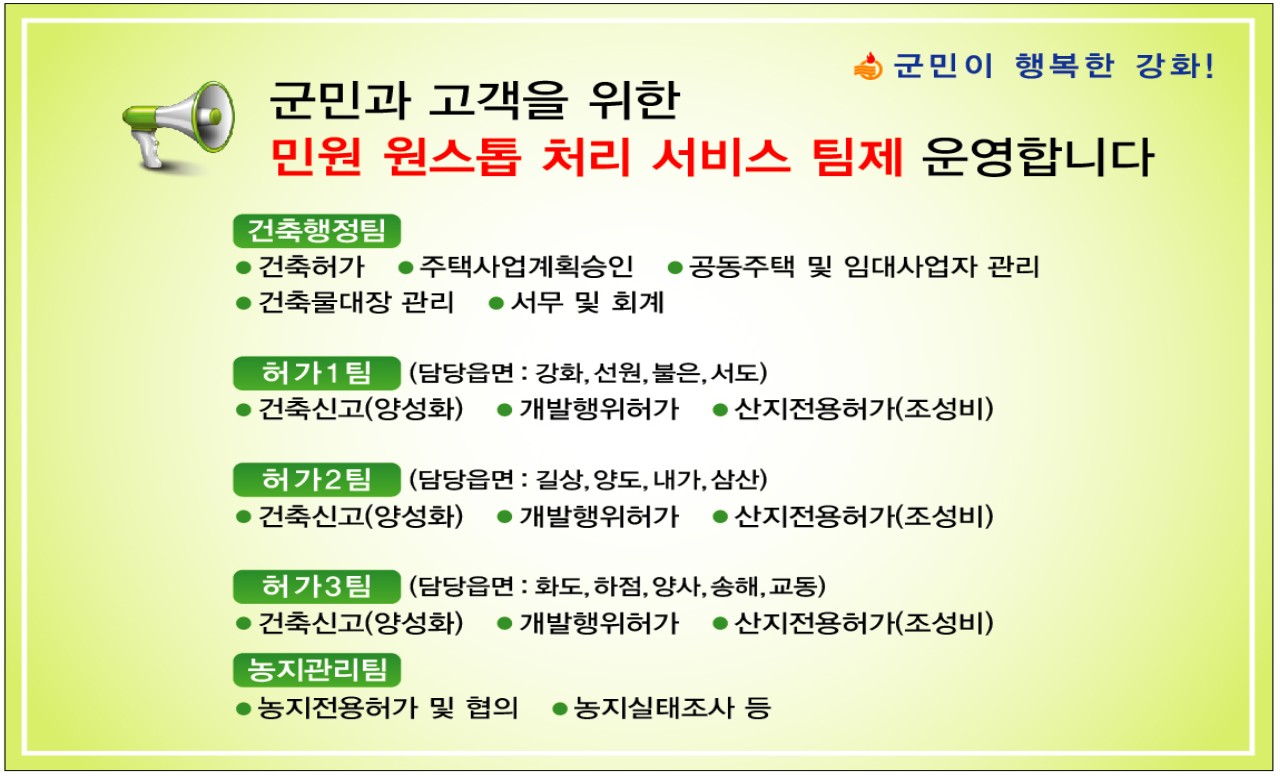허가 1팀은 강화읍, 선원면, 불은면, 서도면, 허가 2팀은 길상면, 양도면, 내가면, 삼산면, 허가 3팀은 화도면, 하점면, 양사면, 송해면, 교동면 지역의 인‧허가 민원을 처리한다.
