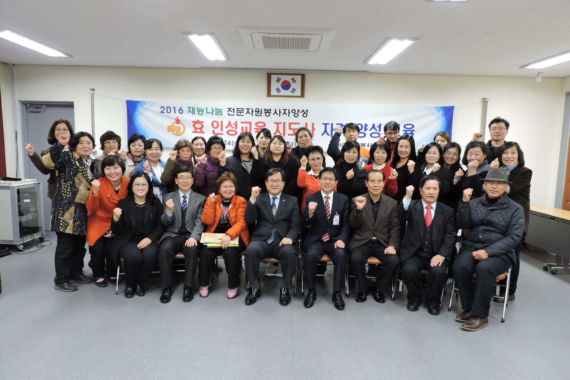 ‘효 인성교육지도사 양성 교육’은 자원봉사자 교육을 통한 신규 잠재 봉사자를 양성 발굴하여 학생의 인성교육 함양과 자원봉사 활동을 활성화하는데 목적이 있다. ‘효 인성교육지도사 양성 교육’을 수료한 봉사자는 관내 초·중·고의 자유학기제와 돌봄 체험학습 운영 프로그램에 강사로 나서 각급 학교의 효 인성교육 봉사활동에 참여하게 된다.