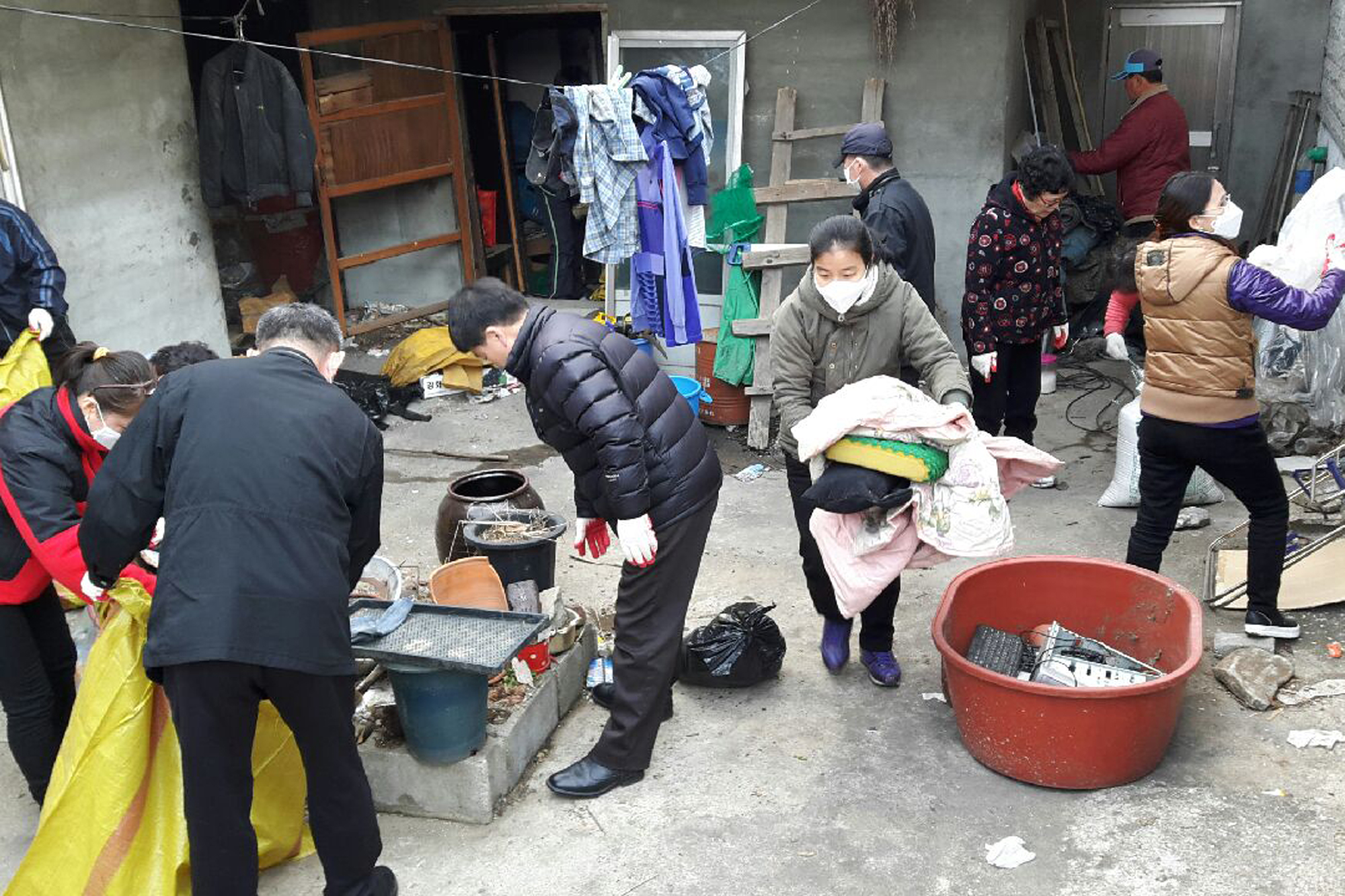 (사진: 강화군청 자원봉사단이 복지사각지대 가구에서 청소 봉사활동을 펼치고 있다)