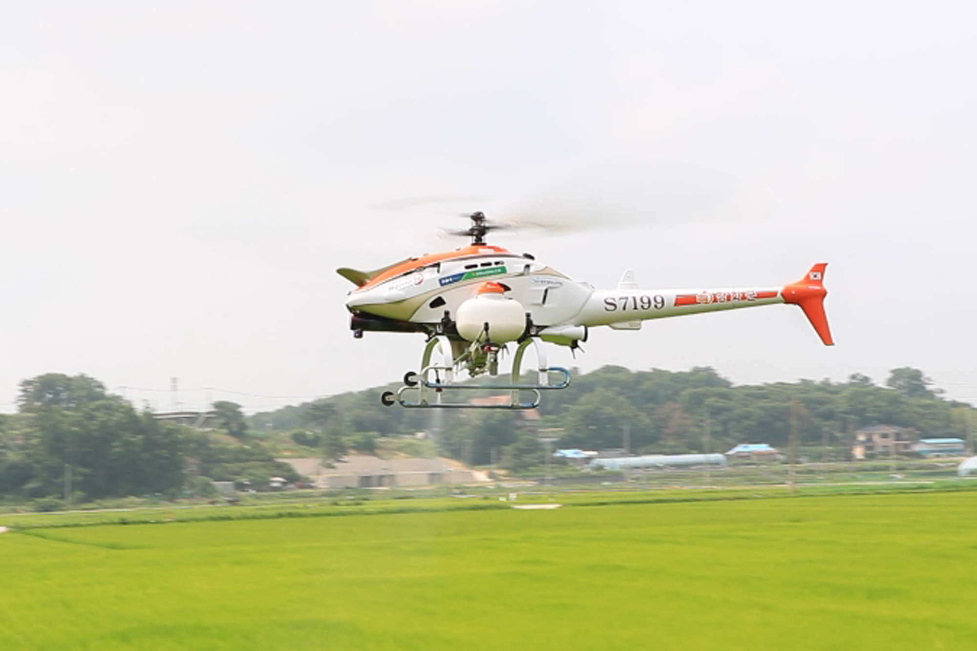(사진: 무인헬기를 이용해 항공방제를 실시하고 있다)