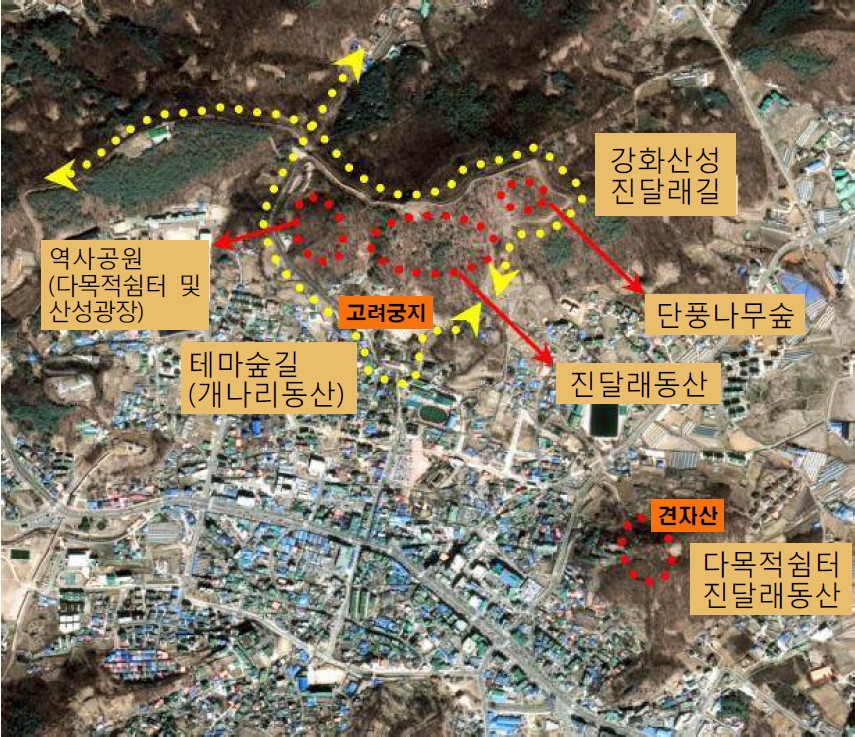 북산 일원에도 강화산성을 따라 2km 구간에 진달래 길을 비롯해 진달래 공원, 역사공원(다목적 쉼터 및 산성 광장), 개나리 테마숲길, 단풍나무 숲을 조성한다. 아울러 견자산 일원에는 2020년까지 강화군 최초의 근린공원을 조성할 계획이다.