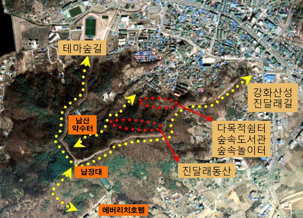 우선 강화읍 남산 일원에는 강화산성을 따라 2.5km 구간에 진달래 길을 비롯해 진달래 동산, 다목적 쉼터, 숲속 도서관, 숲속 놀이터, 테마 숲길을 조성한다.