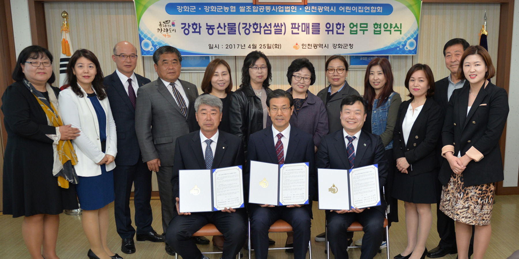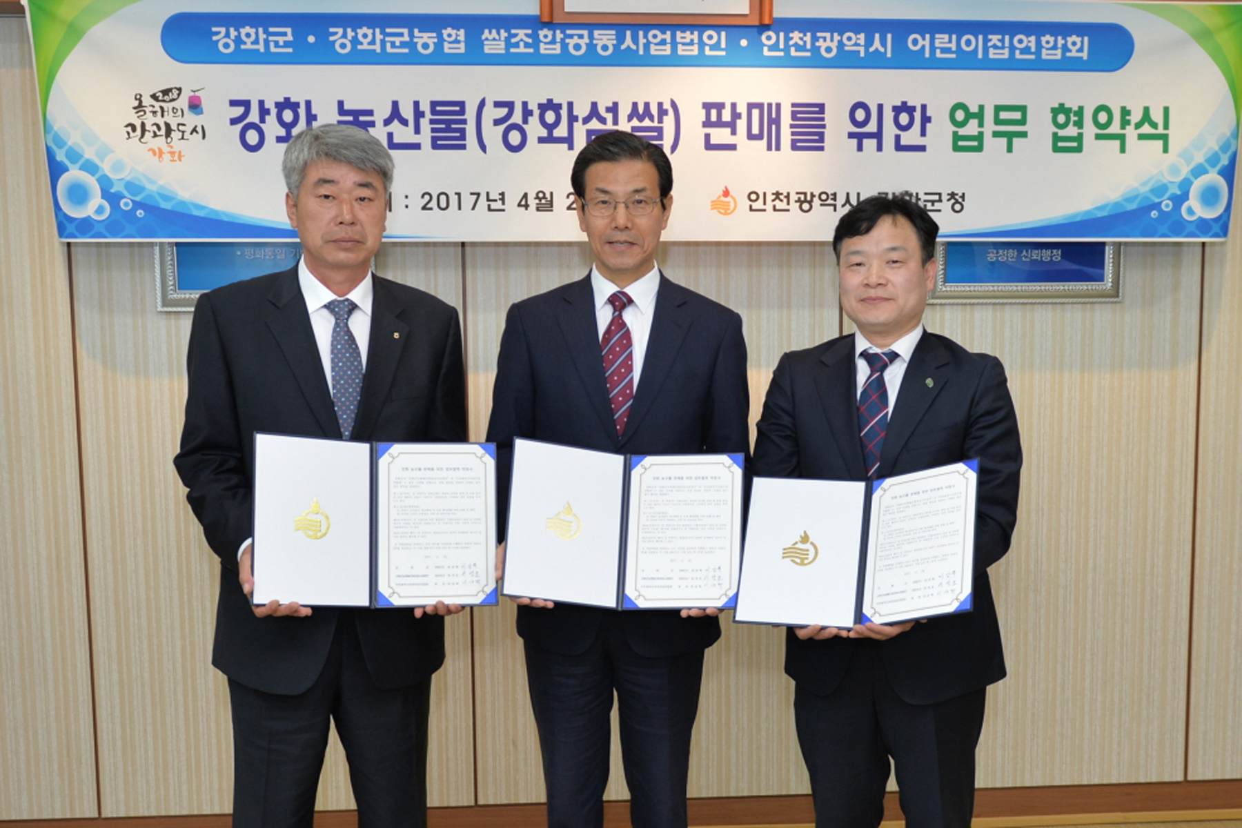 인천시 강화군(군수 이상복)은 지난 25일 군청 군수실에서 강화군농협쌀조합공동사업법인과 인천시어린이집 연합회가 강화섬쌀 판매를 위한 업무협약을 체결했다고 밝혔다.
