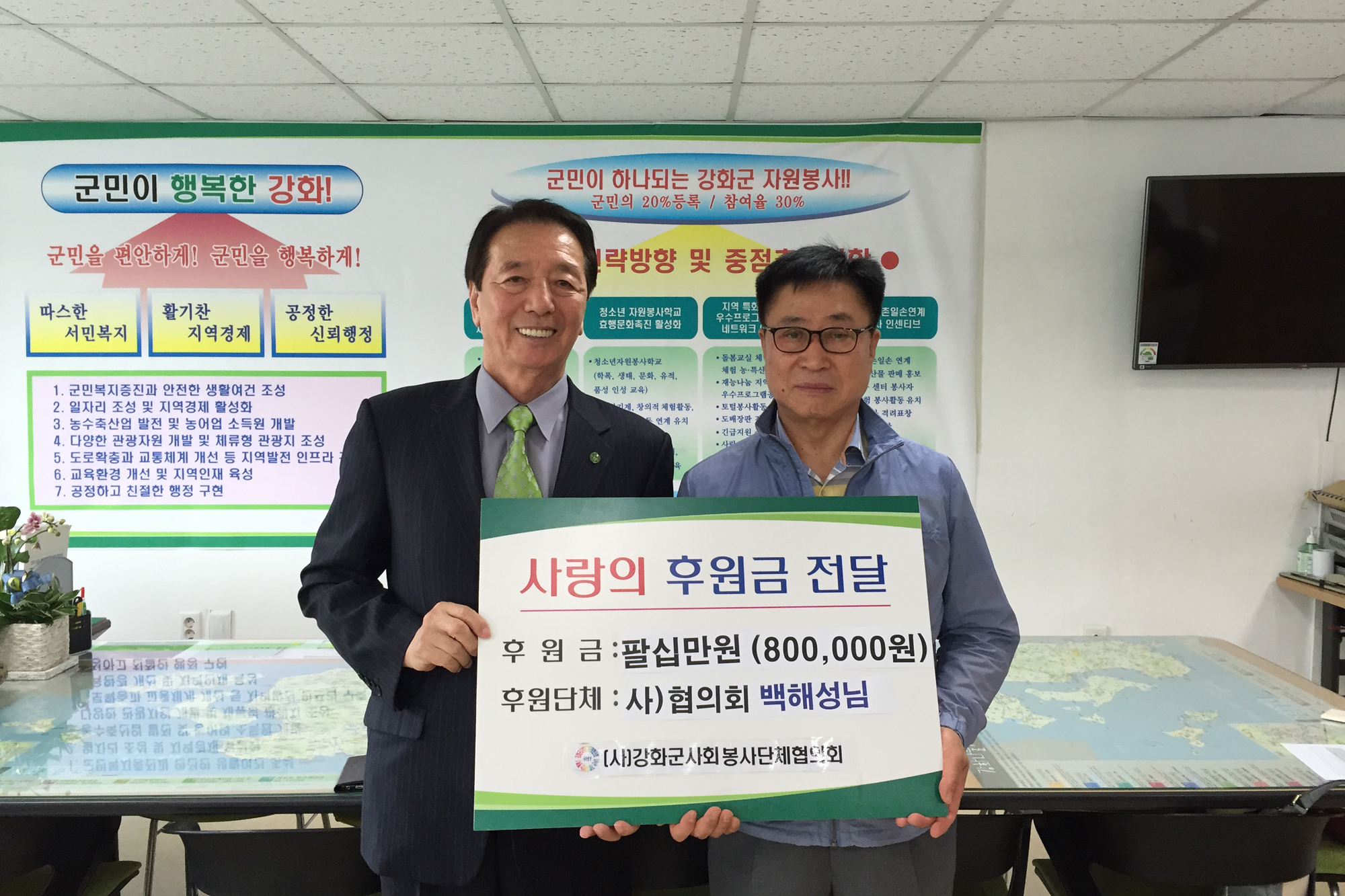 선원면 세광아파트 거주하는 백해성 자원봉사자는 지난 4일 지역사회 저소득층을 위한『사랑의 후원금』 80만원을 사)강화군사회봉사단체협의회(회장 김철호)에 기탁했다.