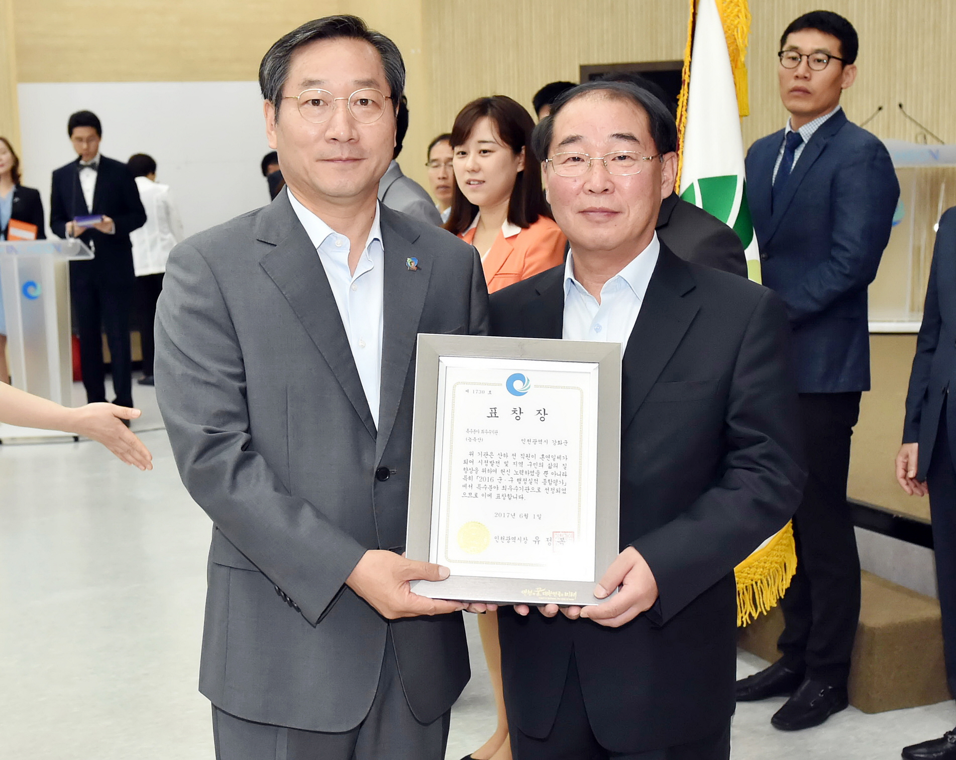 (사진: 정규원 강화군 부군수가 유정복 인천시장으로부터 최우수기관 표창을 수상하고 있다)