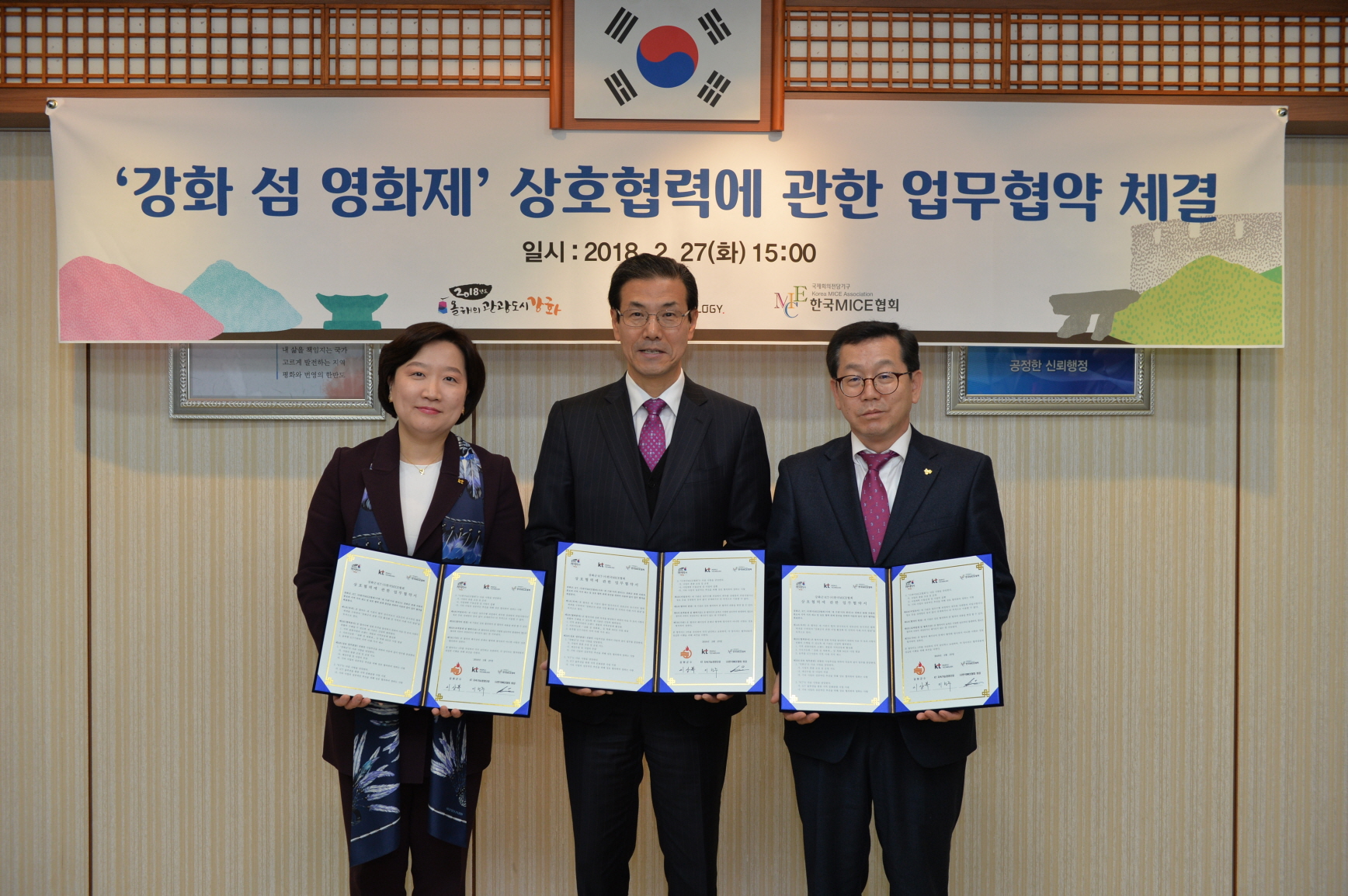 강화군(군수 이상복)은 지난 27일 군수실에서 KT, (사)한국MICE협회와 ‘2018 강화 섬 영화제’ 개최를 위한 MOU를 체결했다. 군은 강화군을 대표할 만한 MICE(회의, 포상관광, 컨벤션, 전기) 콘텐츠를 발굴하고, 매력적인 관광지로 육성하기 위해 이번 영화제를 추진했다.