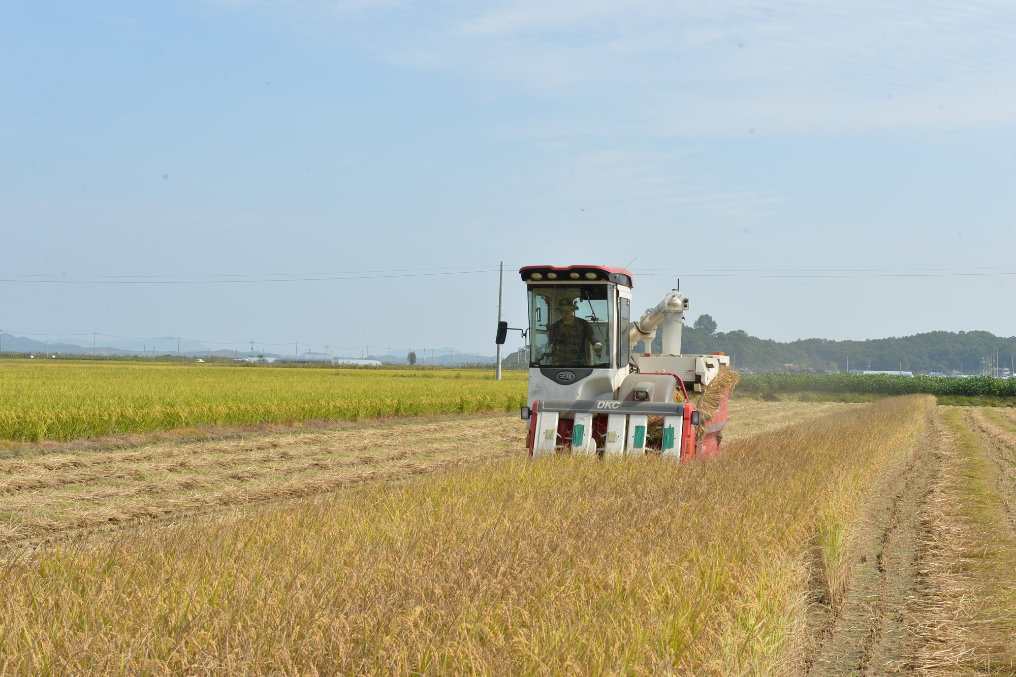 (사진: 강화의 황금들녘에서 벼를 수확하는 모습)
