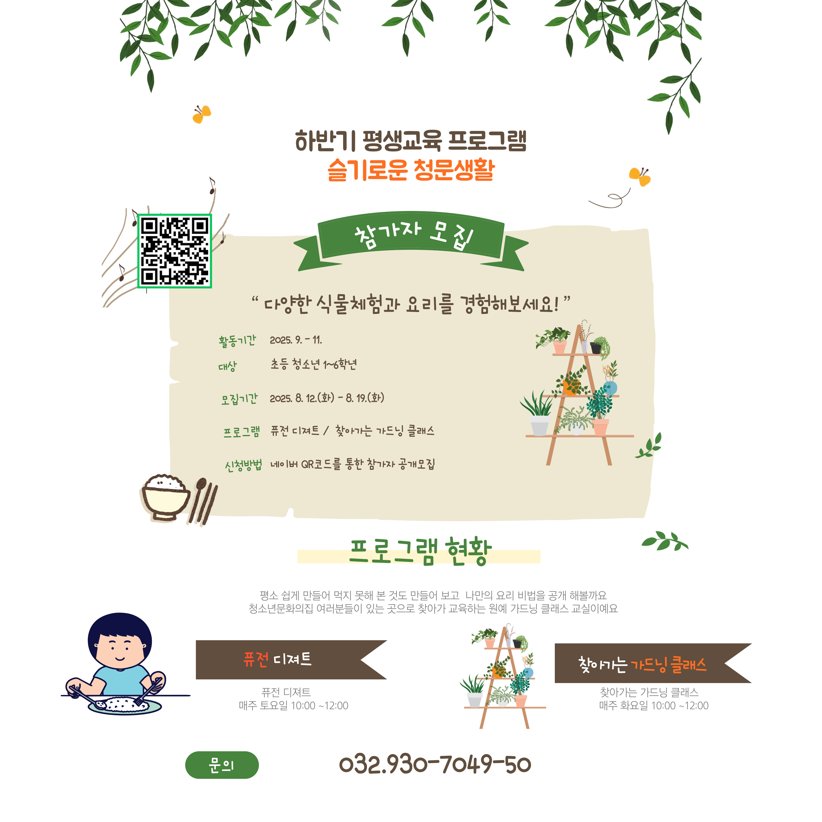 2025년 강화군청소년문화의집 평생교육프로그램 하반기 슬기로운 청문생활 참여자 모집 홍보!!