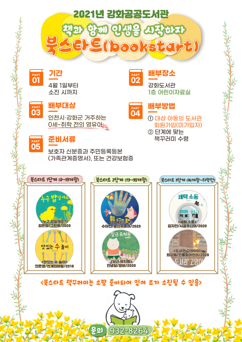 강화군(군수 유천호)은 4월 1일부터 영·유아 대상으로 책과 함께 생애를 시작하는 ‘북스타트 책꾸러미 사업’을 시작한다.