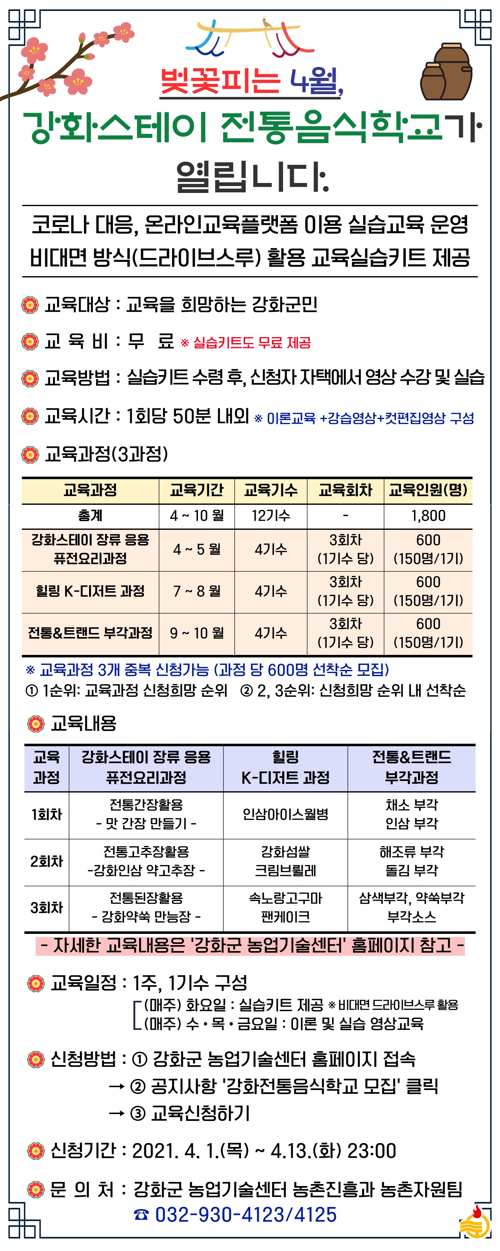 교육은 △장류를 활용한 ‘강화 스테이 전통장 응용 퓨전요리 과정’ △강화인삼, 강화섬쌀, 속노랑 고구마를 활용한 ‘힐링 K –디저트 과정’ △도라지, 풋고추, 새우젓 등을 활용한 ‘전통&트랜드 부각 과정’ 등 3개 과정이다.
