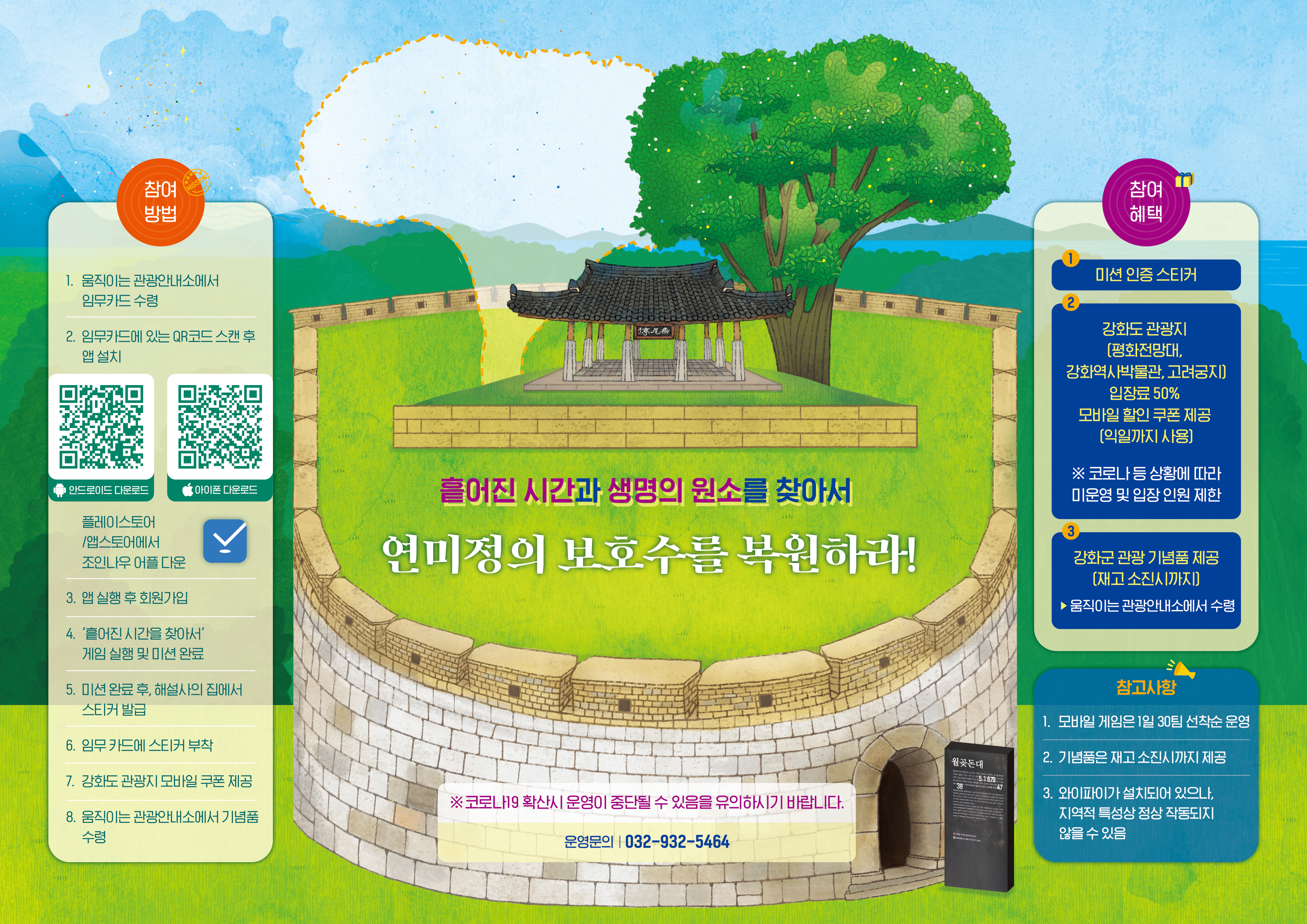 연미정을 방문해 미션을 완수하면 강화군의 주요 관광지인 평화전망대, 강화역사박물관, 고려궁지 등 입장료 50%할인권과 소정의 관광기념품 제공된다. 게임은 연미정에 위치한 ‘움직이는 관광안내소’에서 임무 팝업북을 수령받고 ‘조인나우’ 어플을 설치한 후 참여할 수 있다. 임무 팝업북은 매주 금‧토‧일에 배포한다.
