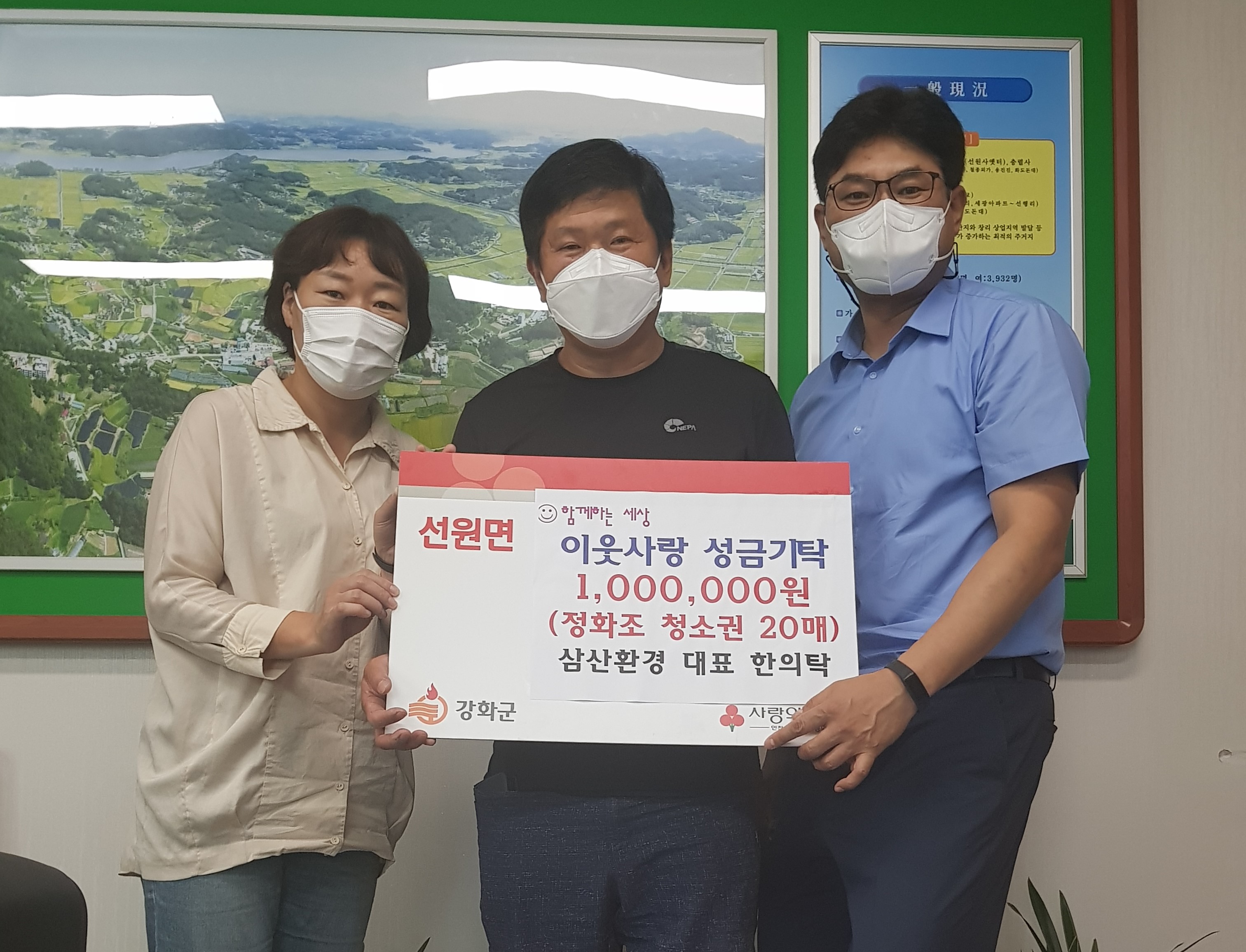 강화군 선원면(면장 서광석)은 관내 업체인 삼산환경(대표 한의탁)이 추석 명절을 앞두고 선원면사무소를 찾아 지역 내 어려운 이웃을 위해 써달라며 100만원 상당의 정화조 청소쿠폰과 현금 100만원을 전달했다고 8일 밝혔다.