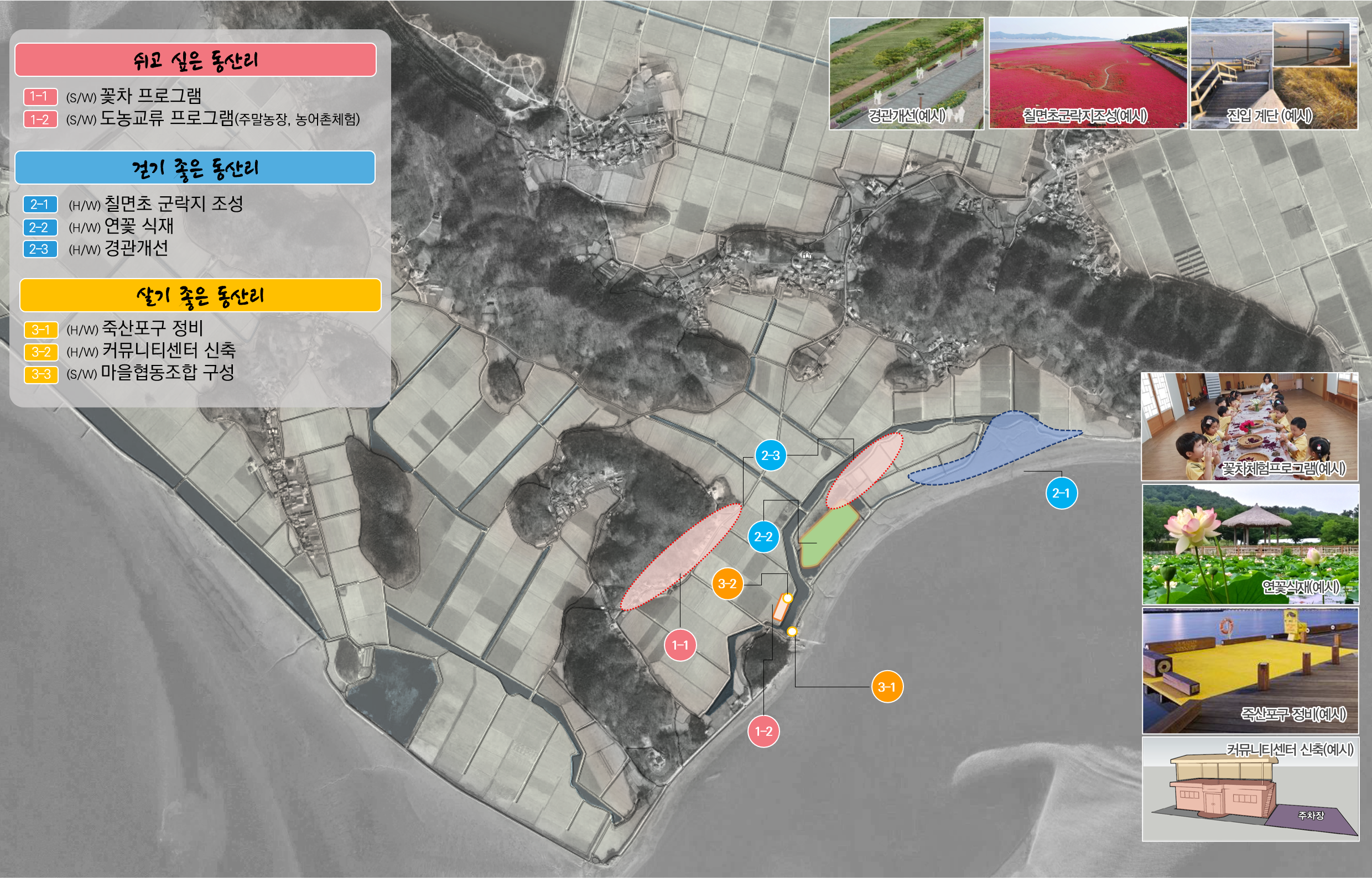 군은 사업비 21억 원을 투입해 ‘쉬고 싶은 동산리’, ‘걷기 좋은 동산리’, 살기 좋은 동산리‘를 구축할 계획으로 빼어난 자연환경을 이용해 칠면초 군락지를 새롭게 조성하고, 죽산포구, 커뮤니티센터 등 기반시설을 보강해 정주여건을 개선할 방침이다.