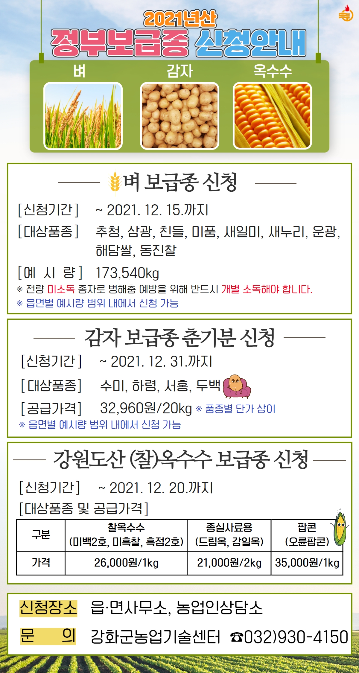 옥수수 보급종은 오는 20일까지 찰옥수수(미백2호, 흑점2호, 미흑찰), 종실사료용(드림옥, 강일옥), 팝콘용(오륜팝콘) 6개 품종에 대해 접수받는다. 공급가격은 찰옥수수 26,000원/kg, 종실사료용 21,000원/2kg, 팝콘용 35,000원/kg이다.