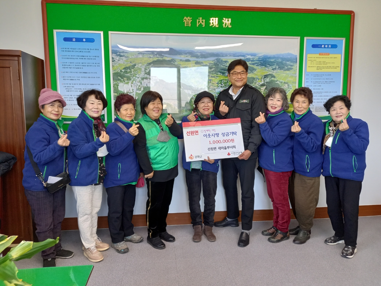 강화군 선원면 새마을부녀회(회장 유갑희)가 지난 10일 지역의 어려운 이웃을 위한 성금 100만 원을 선원면사무소에 기탁하며 훈훈한 새해를 맞이했다.