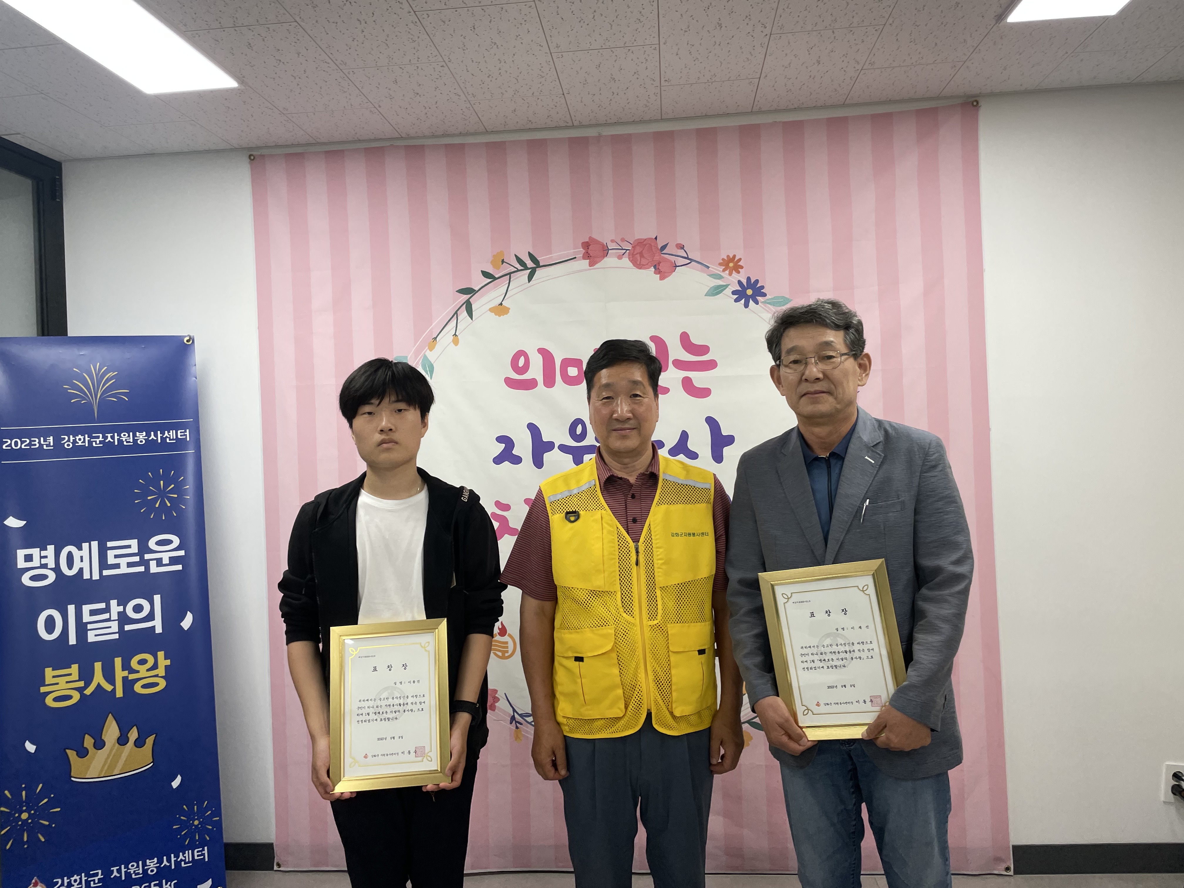올해 2분기 시상은 지난 1월부터 3월까지 월별 최다 활동자에 대해 시상을 가졌다. 선정자는 이재선, 장경순, 이용건, 김하은, 전예진, 정현준, 황예은(이상 개인 봉사자), 장상수(강화군 모범운전자회), 김선화(강화군 녹색어머니회), 사영애(강화읍 자원봉사상담가) 성인 6명, 청소년 4명이 수상의 영예를 안았다.