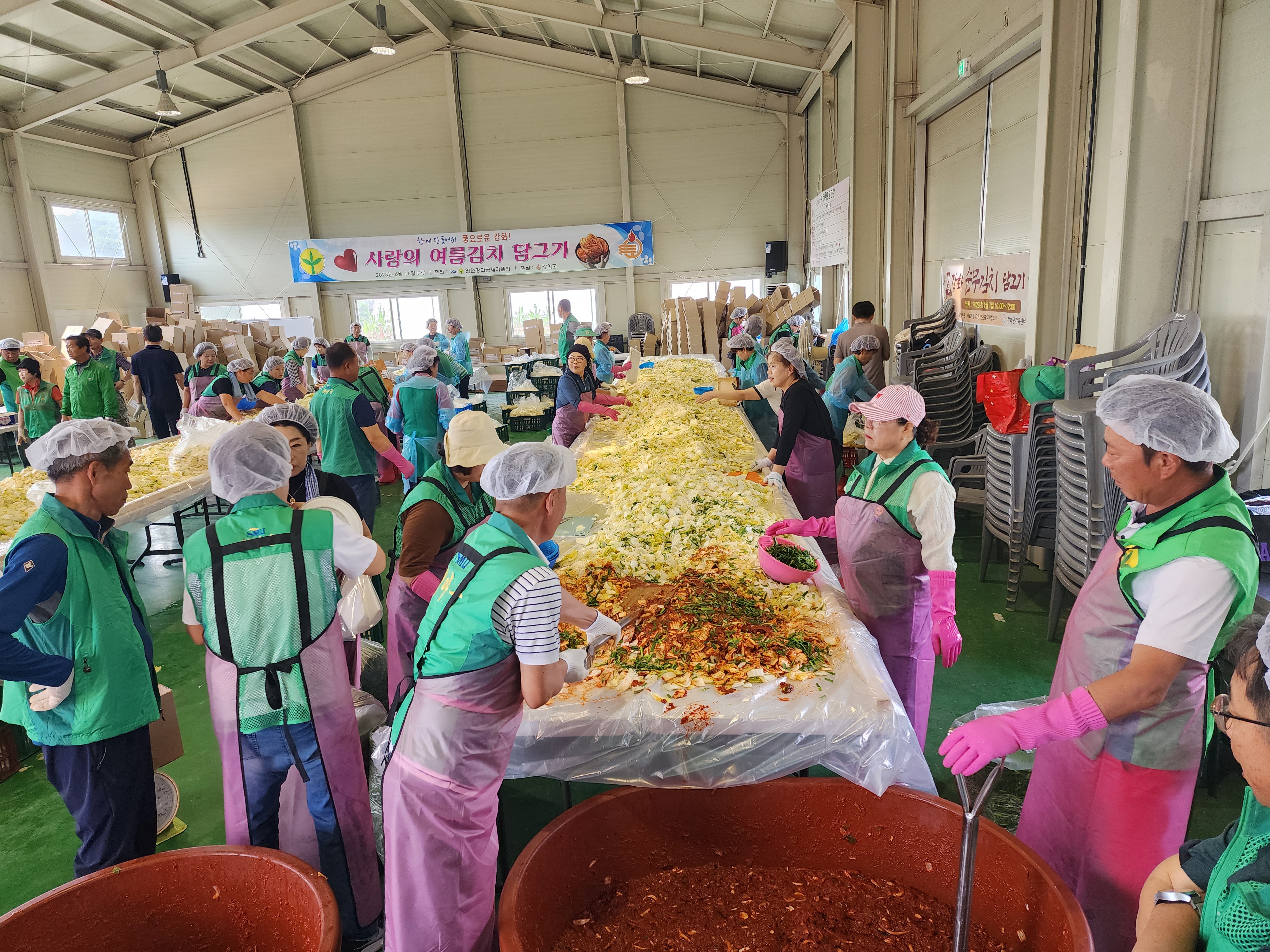이날 행사는 강화군 새마을부녀회(회장 이임순)와 새마을지도자협의회(회장 이범택)의 주관으로 회원 70여 명이 참석해 여름김치를 직접 담가 취약계층 800세대에 전달했다.