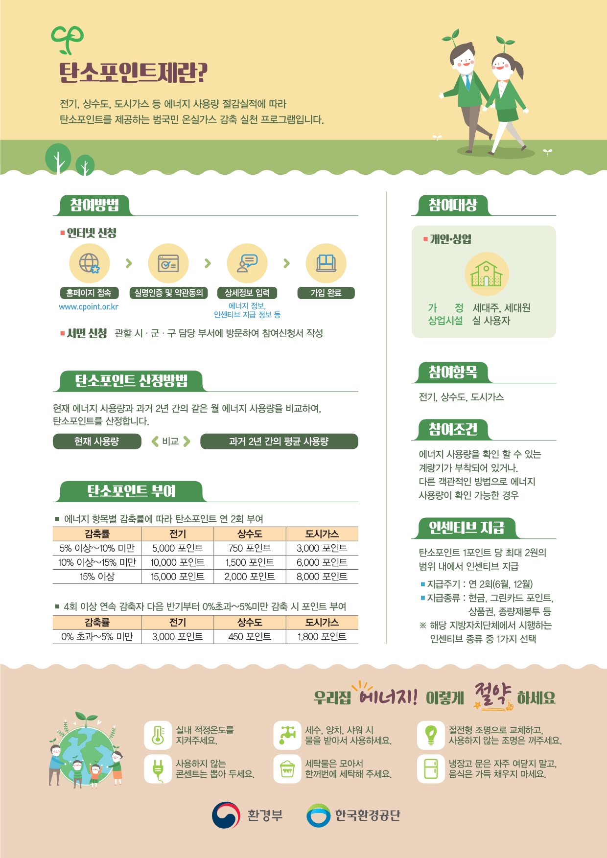 탄소중립포인트제란 가정 또는 상업시설, 아파트 단지 등에서 전기‧상수도‧ 도시가스 등의 에너지 사용량 절감 실적에 따라 온실가스 감축률에 상응하는 인센티브를 제공하는 범국민 온실가스 감축 실천 프로그램을 의미한다.