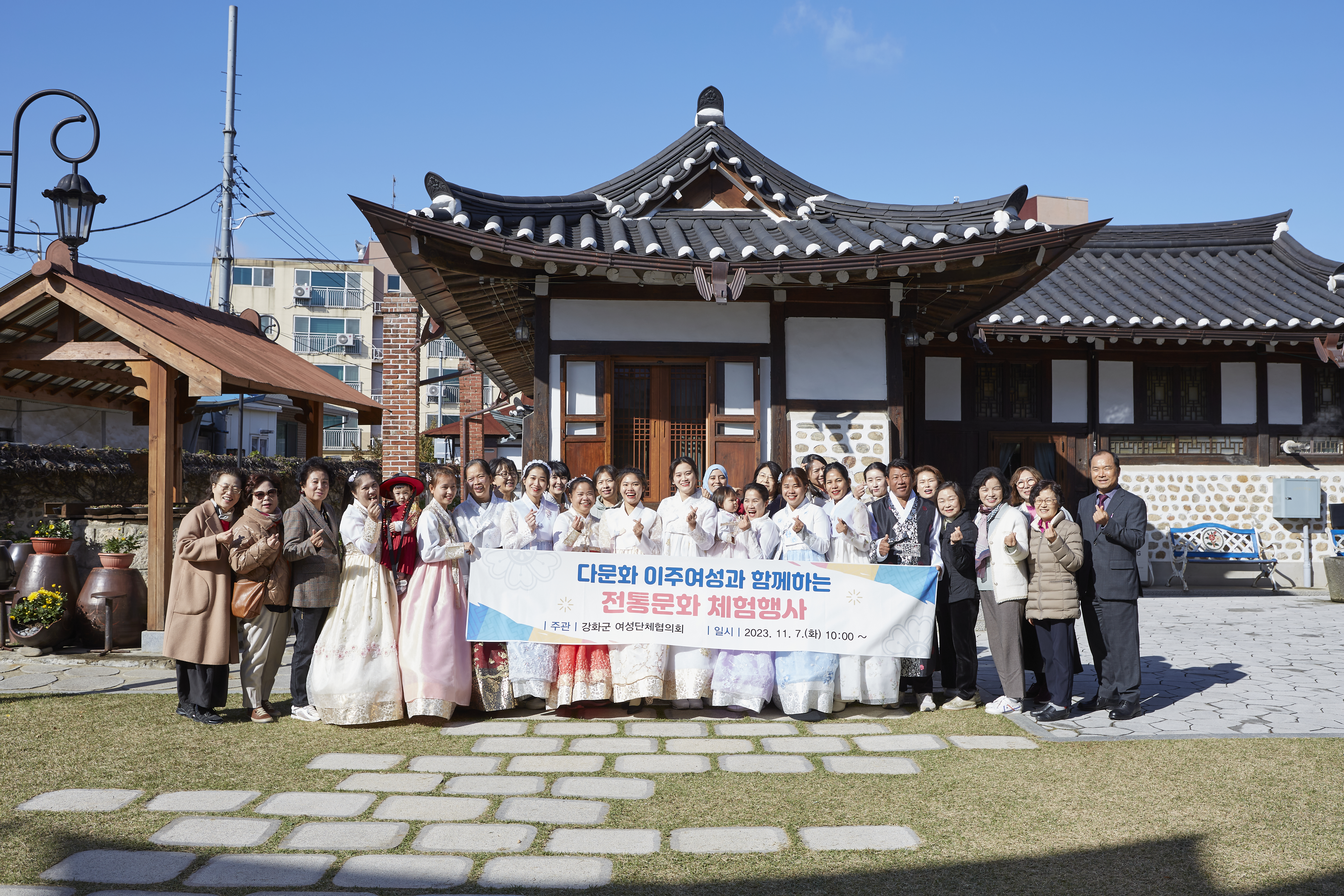 ‘다문화 이주여성과 함께하는 전통문화 체험 행사’는 강화군 여성단체협의회에서 진행하는 특화사업이다. 해외 이주여성들이 한국 문화를 익힐 수 있도록 다양한 문화체험을 하며, 이를 통해 한국 문화에 대한 감수성과 서로 간의 화합의 시간을 갖게 하여 한국 생활 정착에 도움을 주고자 매년 진행하고 있다.