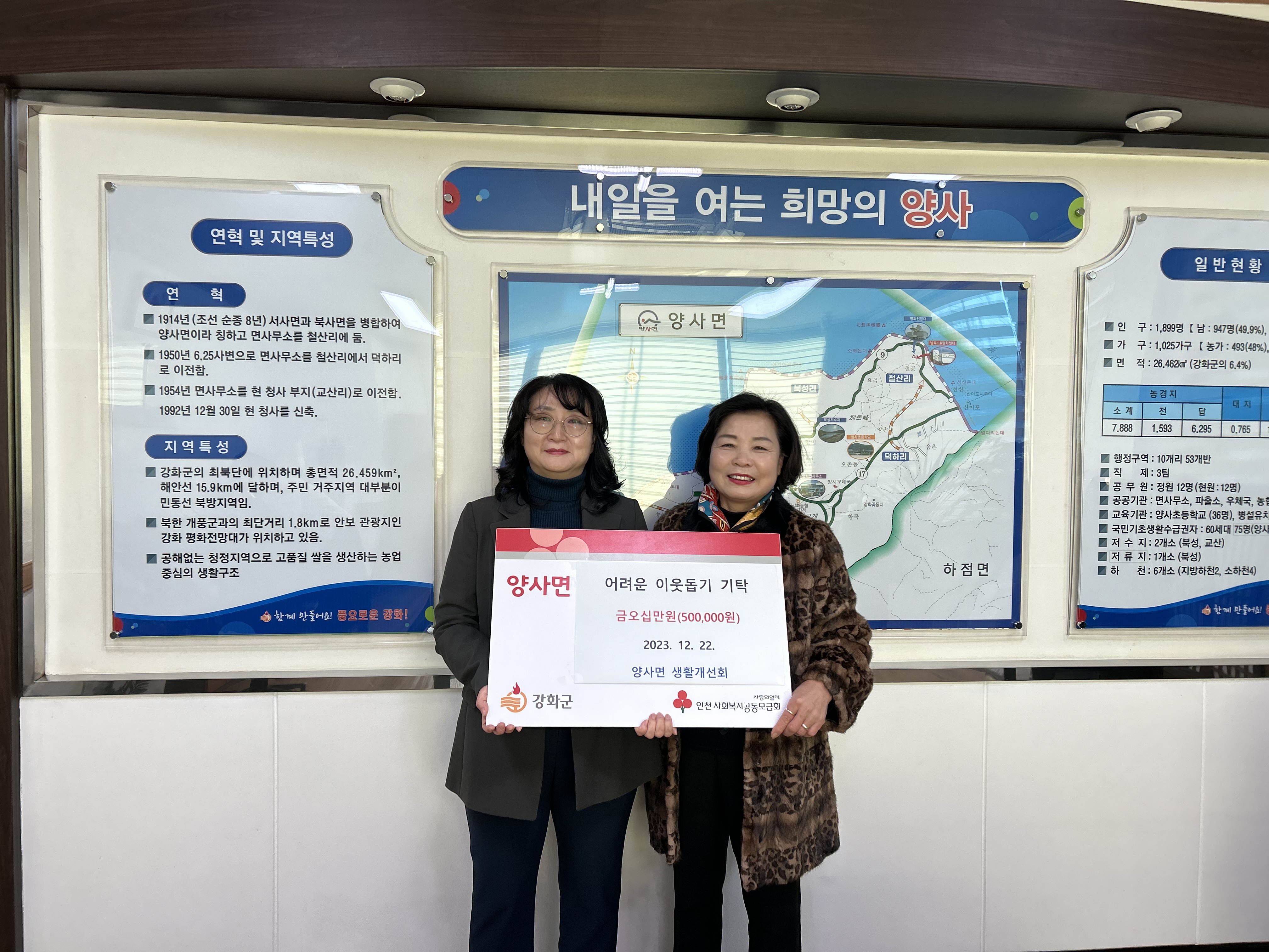 또한, 같은 날 양사면 생활개선회(회장 박연자)에서 이웃돕기 성금으로 50만 원을, 20일에는 천주교 하점성당(신부 요셉)에서 성금 100만 원을 기탁하며 훈훈함을 더했다.